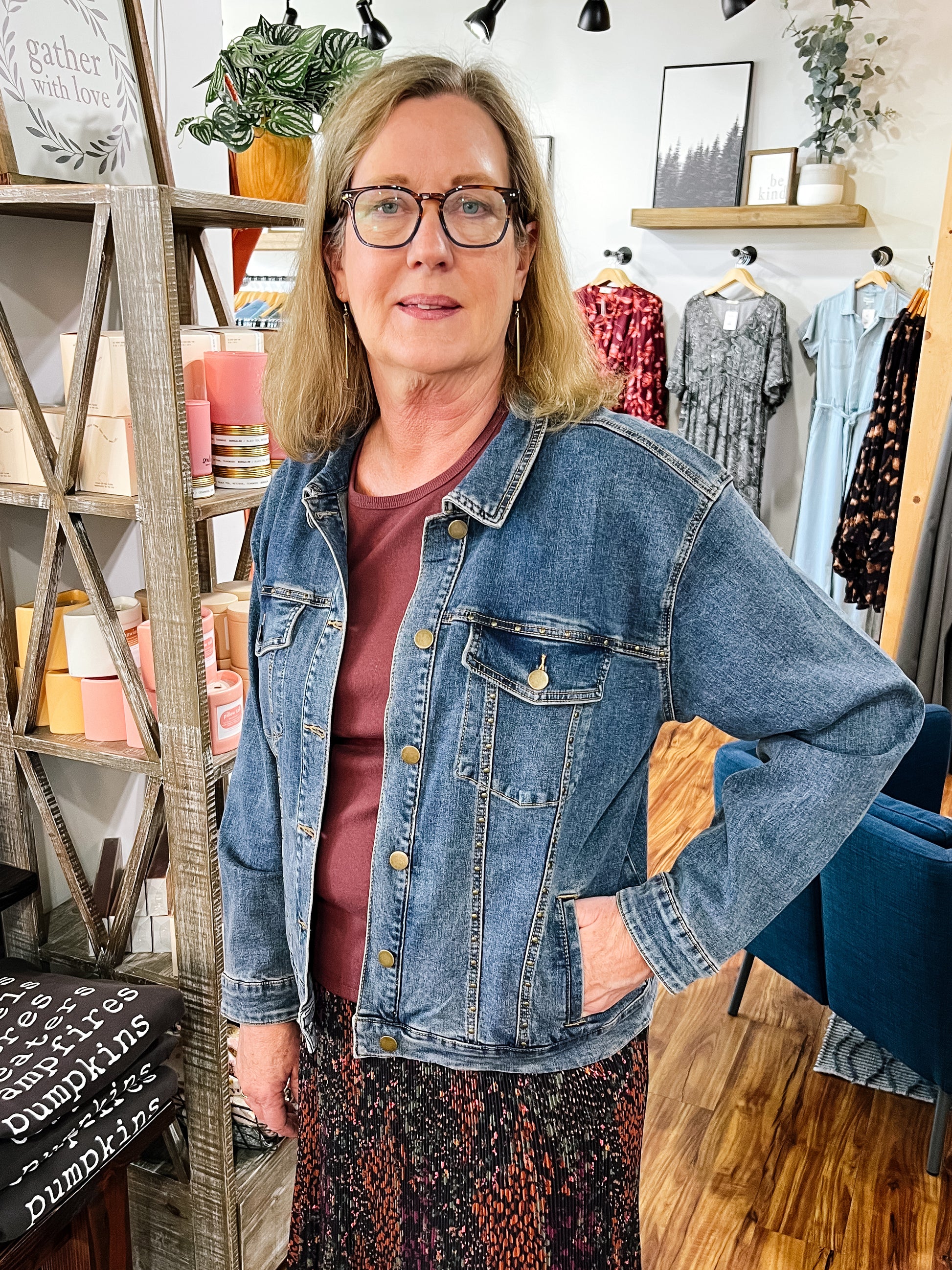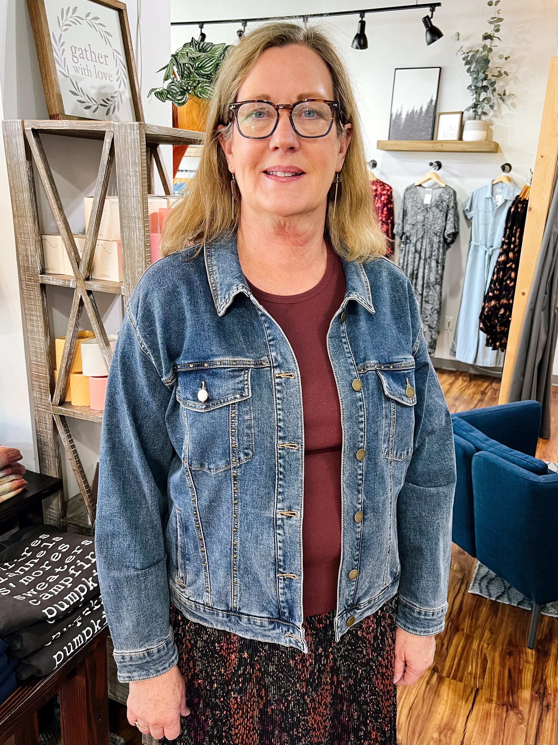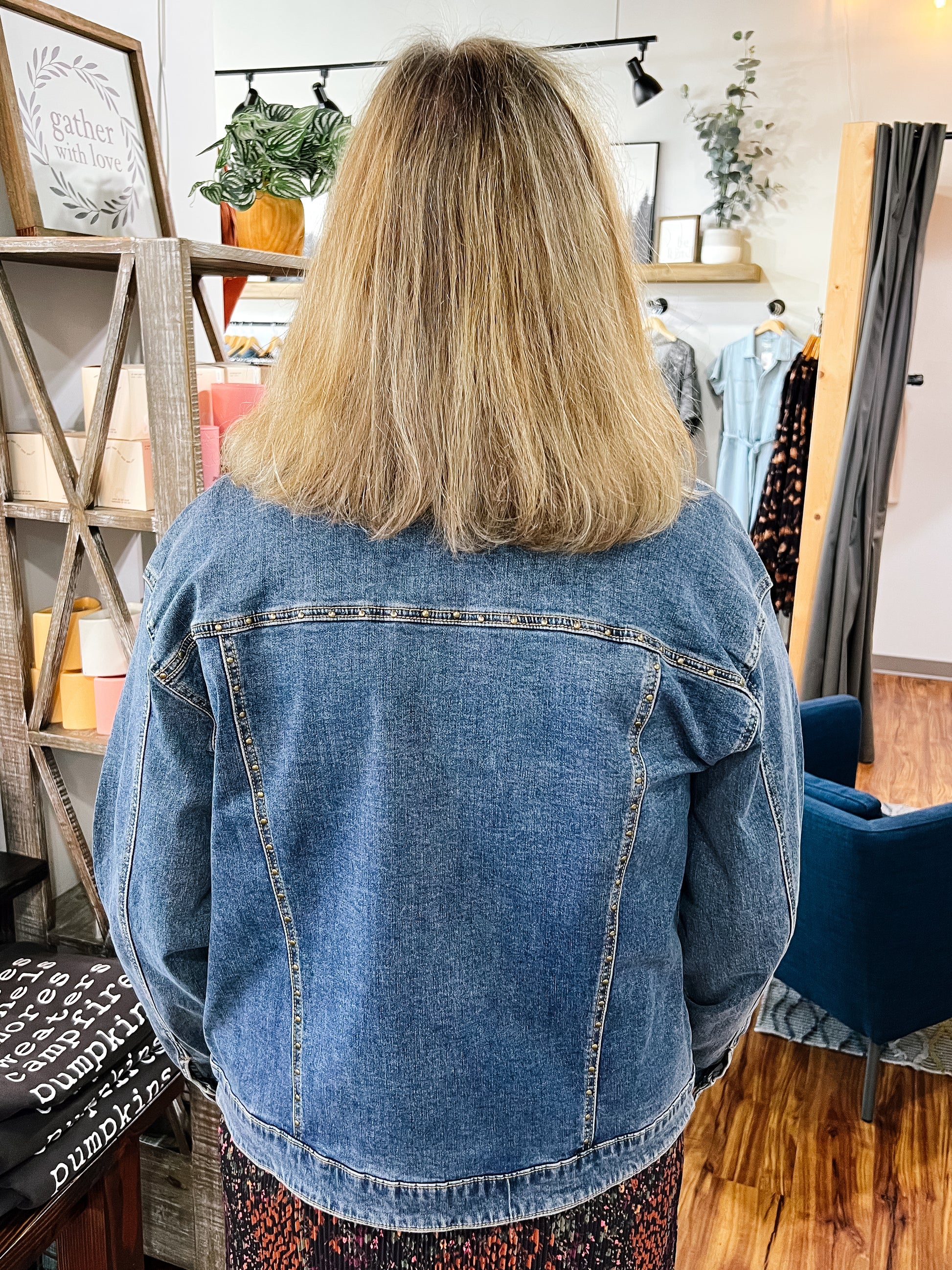 Product Description: This medium wash denim jacket gets a modern twist with subtle studded detailing throughout, while classic gold stitching keeps it timeless. Designed with a slightly boxy fit, it features a soft feel, button-down front, and both breast and side slit pockets for everyday ease. Layer it over dresses for a touch of edge or pair it with your favorite tee and jeans for a cool, casual vibe.