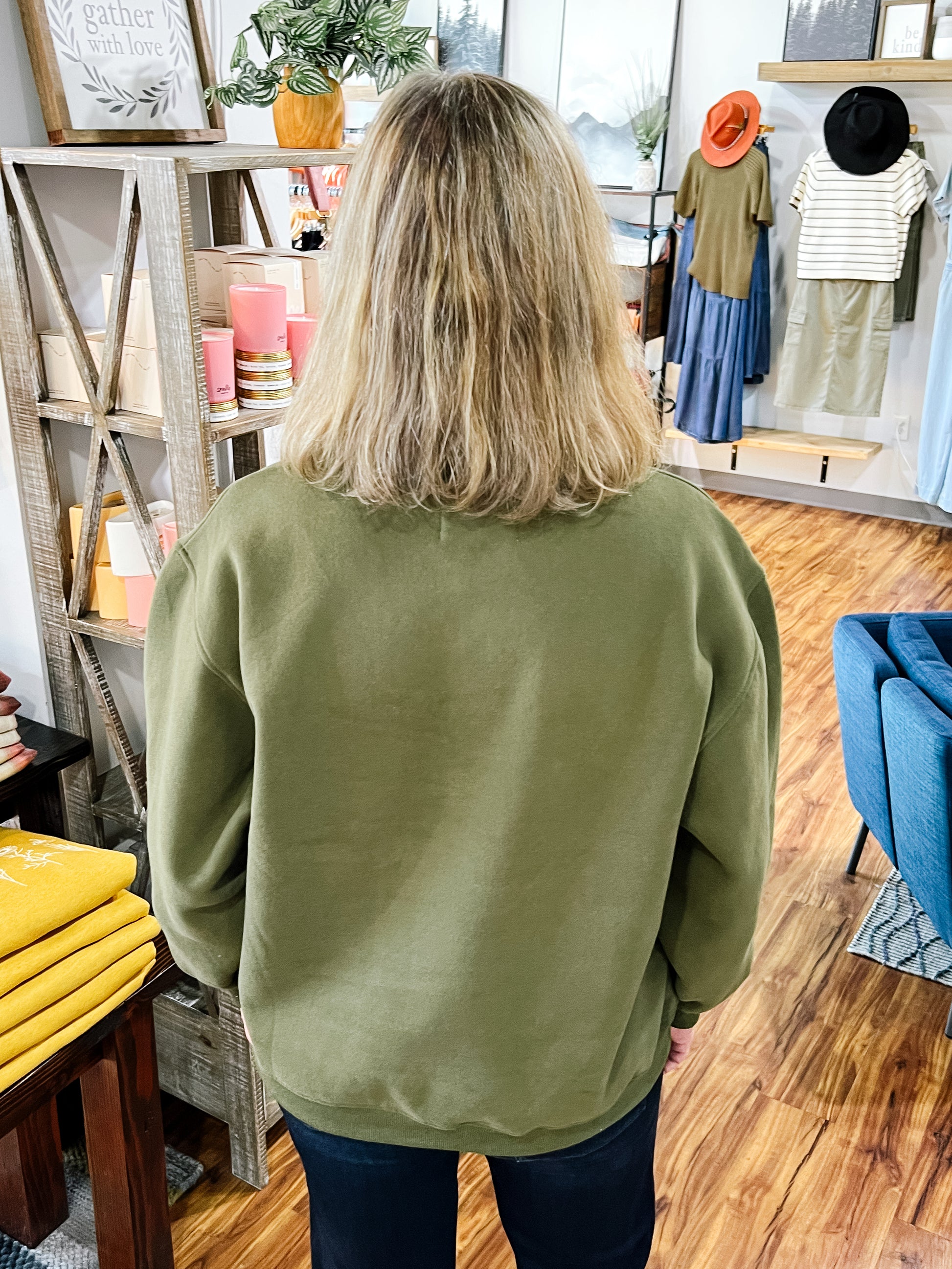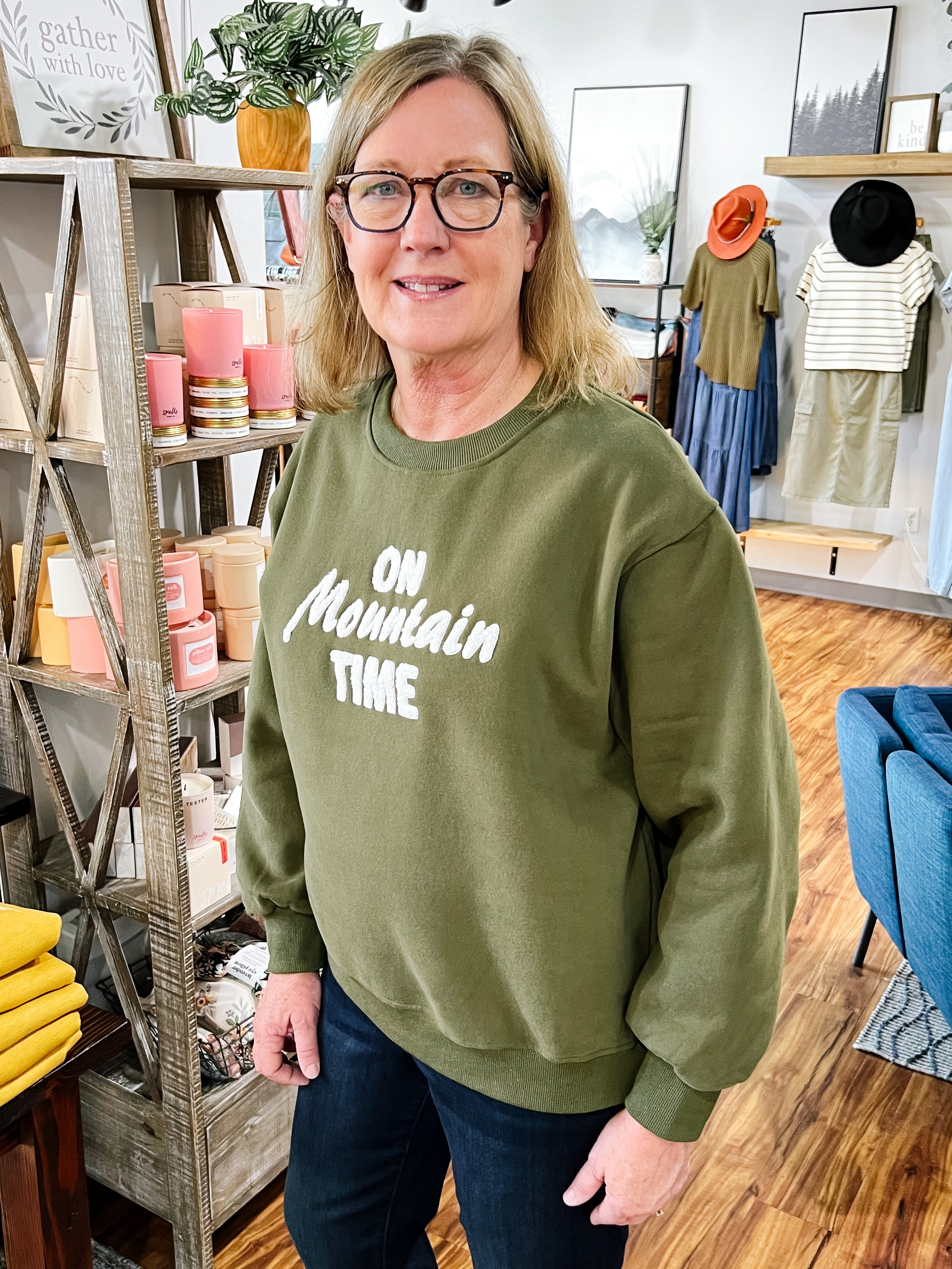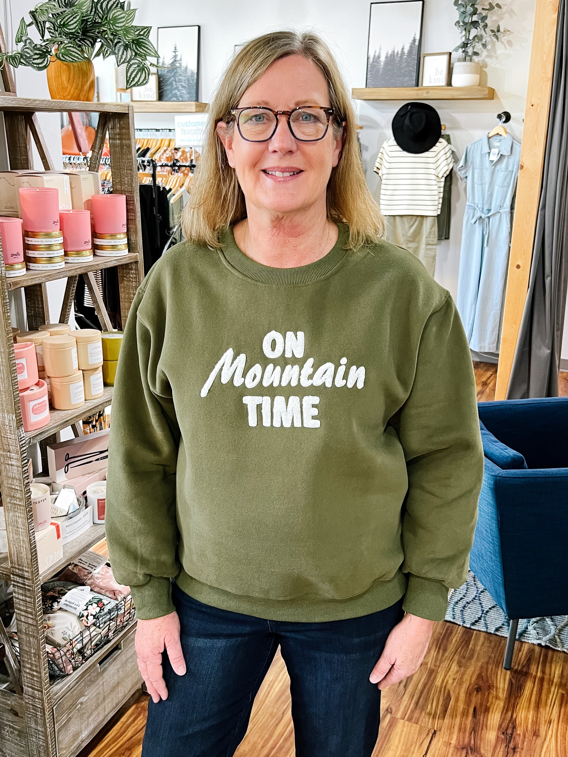 Product Description: A cozy olive green heavyweight crewneck featuring On Mountain Time in fuzzy embroidered lettering. Soft, warm, and perfect for layering on chilly days, this sweatshirt brings comfort with a touch of mountain-inspired charm.