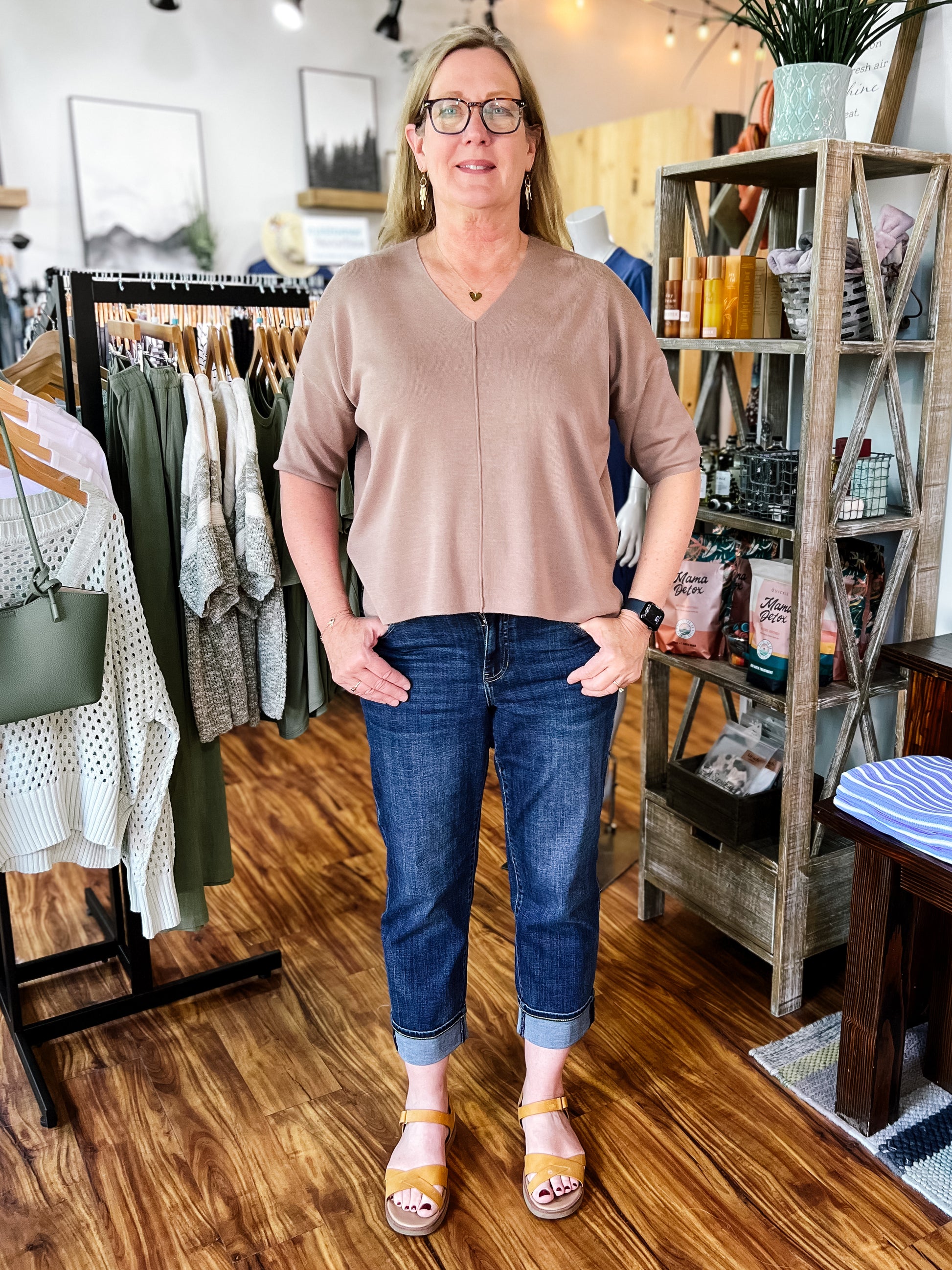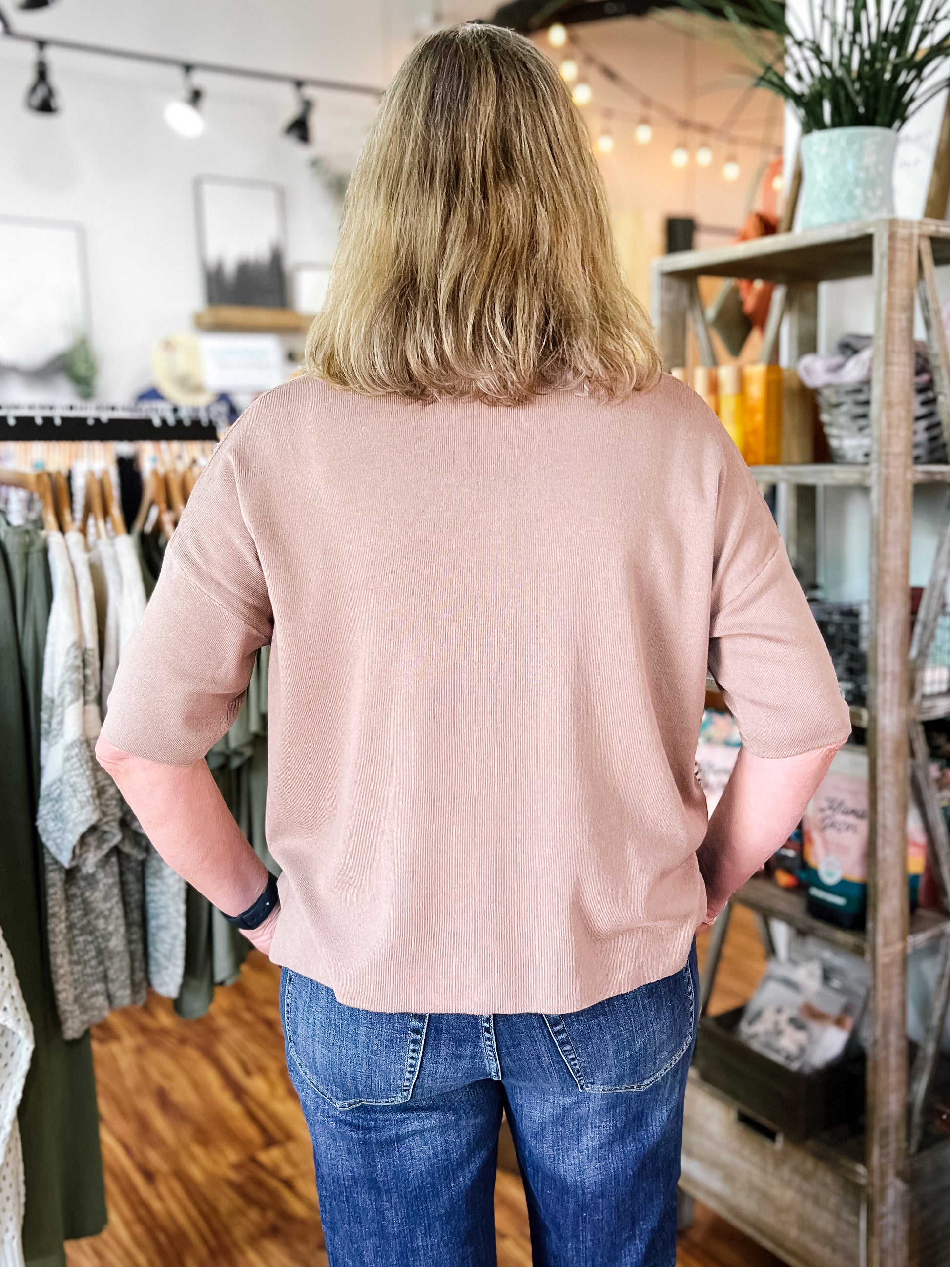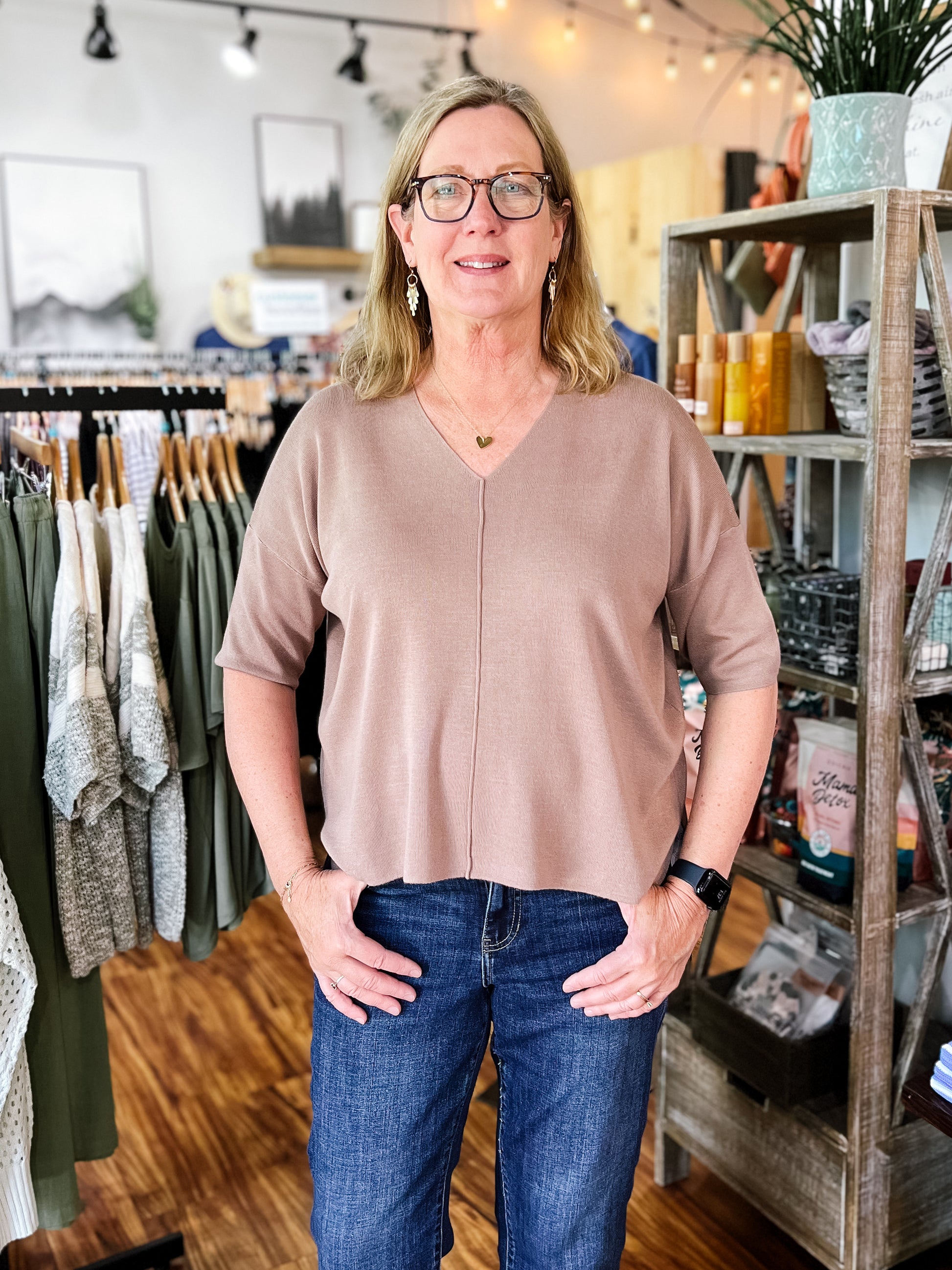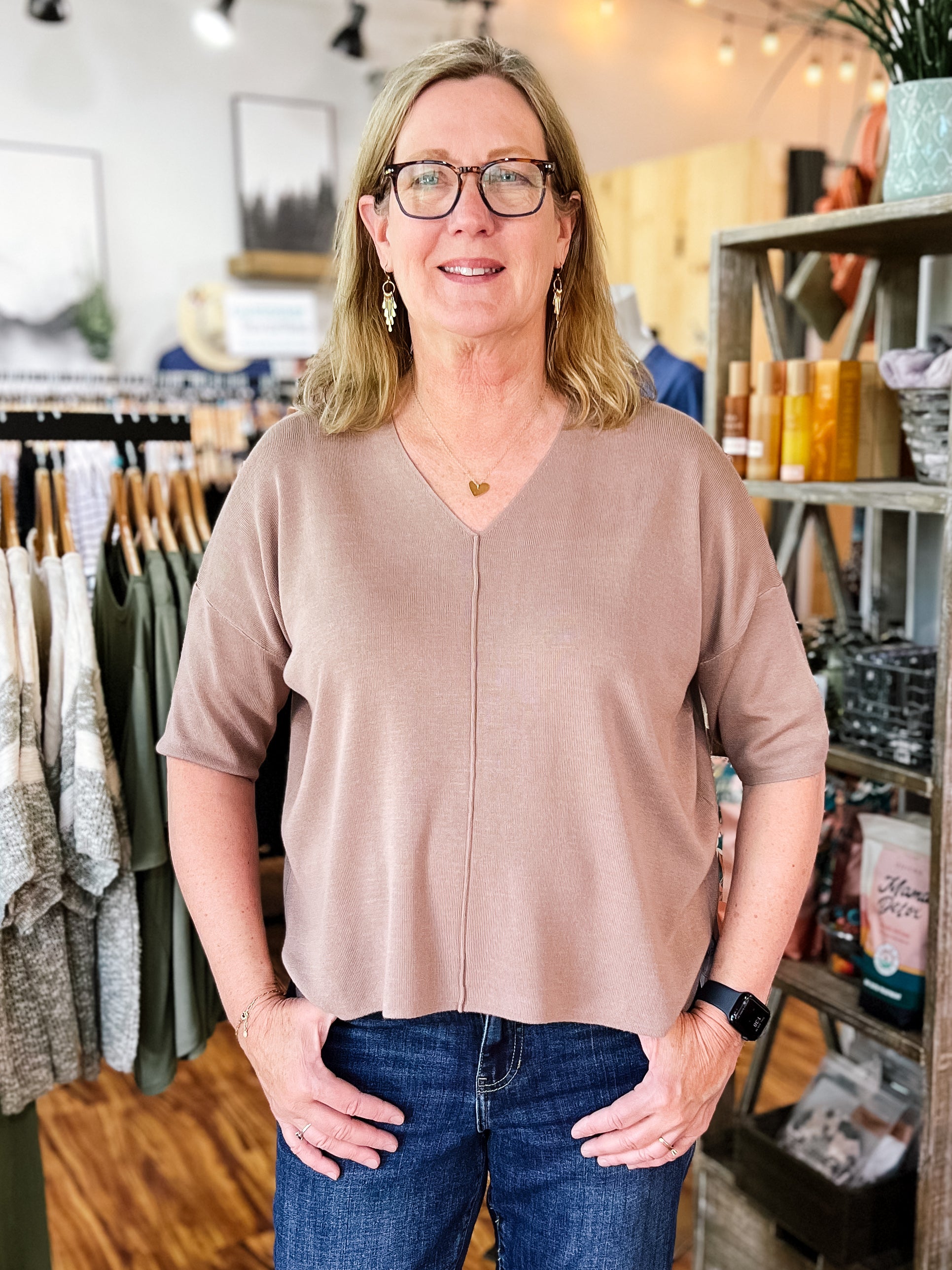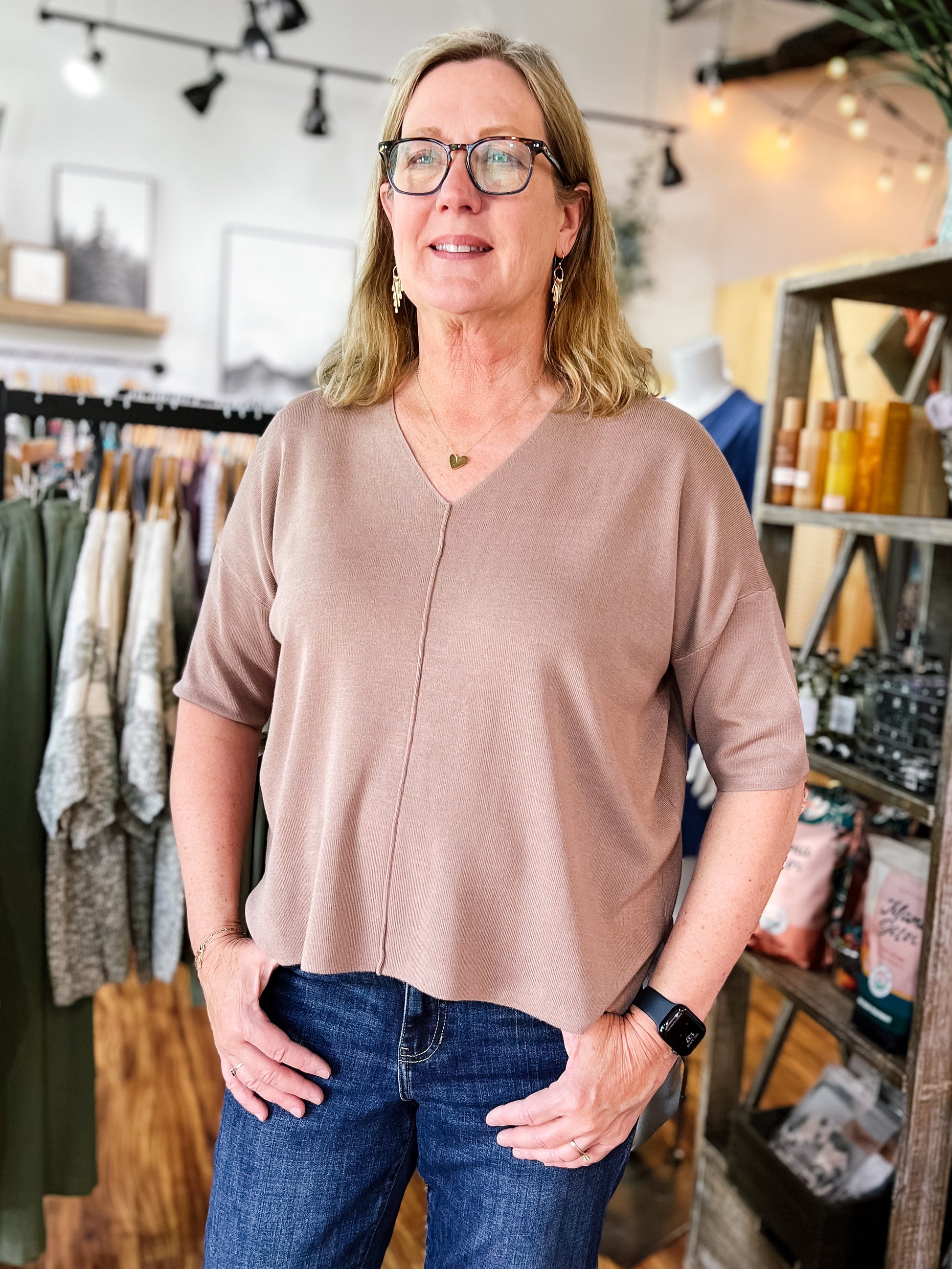Product Description: This mocha brown short sleeve sweater features a relaxed drop shoulder design and a loose, flowy fit. The v-neckline and front seam add subtle detail, while side slits offer easy movement. A lightweight and effortless piece perfect for warm-weather layering.