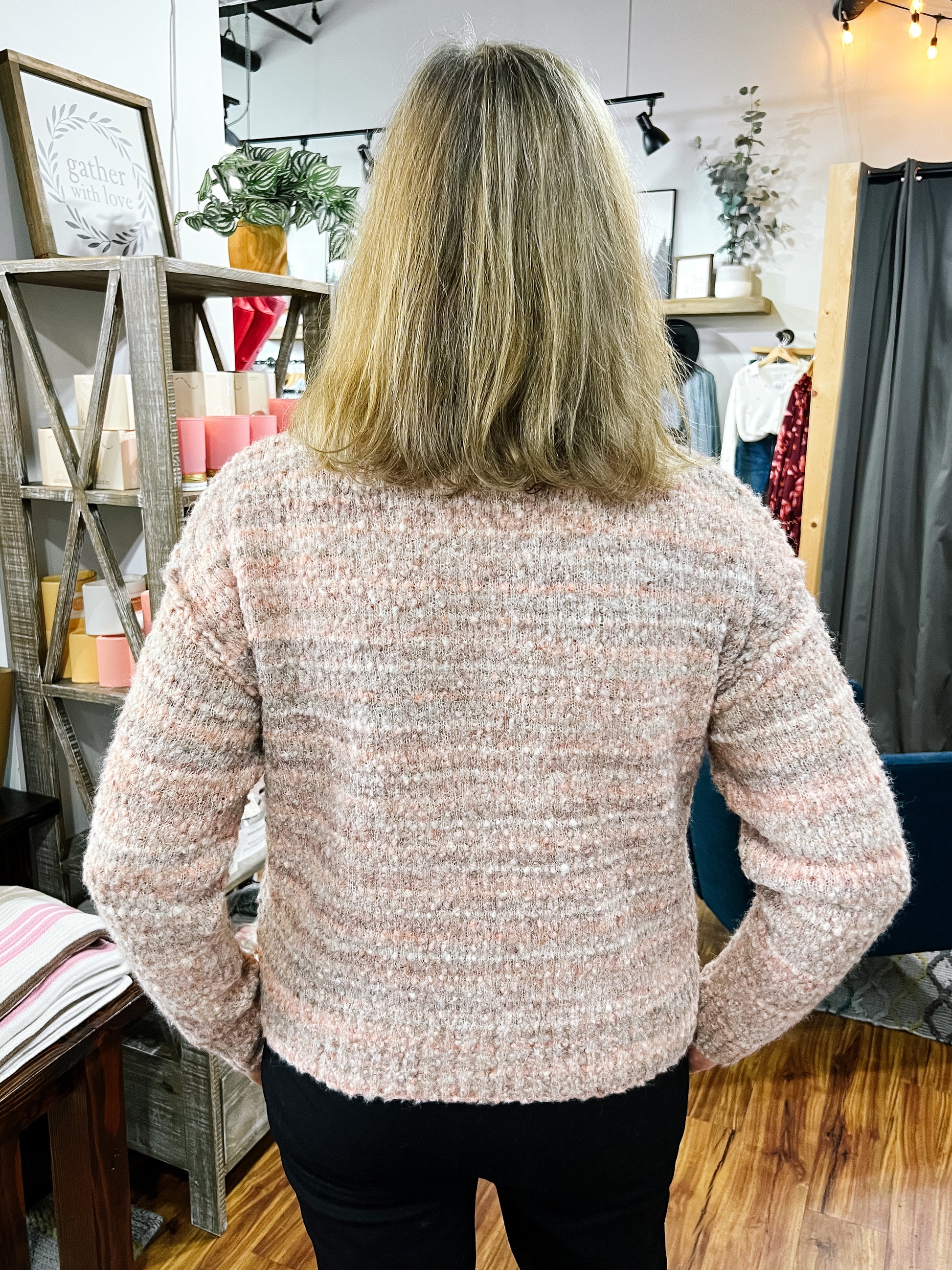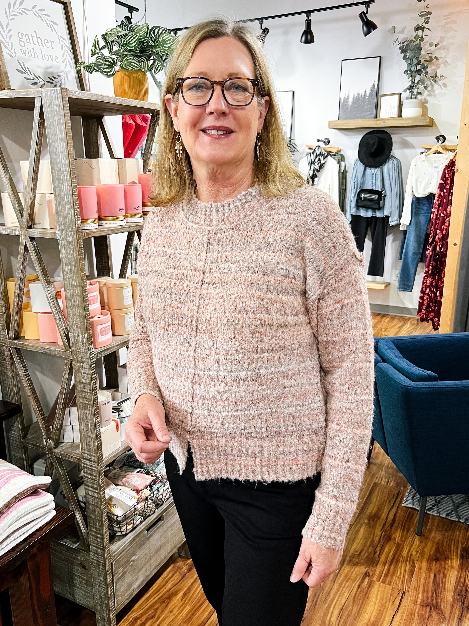 Product Description: Cozy texture meets rich fall tones in this round-neck bouclé knit. Designed with raw seam edging and a subtle front split, it adds a modern touch to a soft, easy-to-wear silhouette. Perfect for pairing with denim or casual pants all season long.