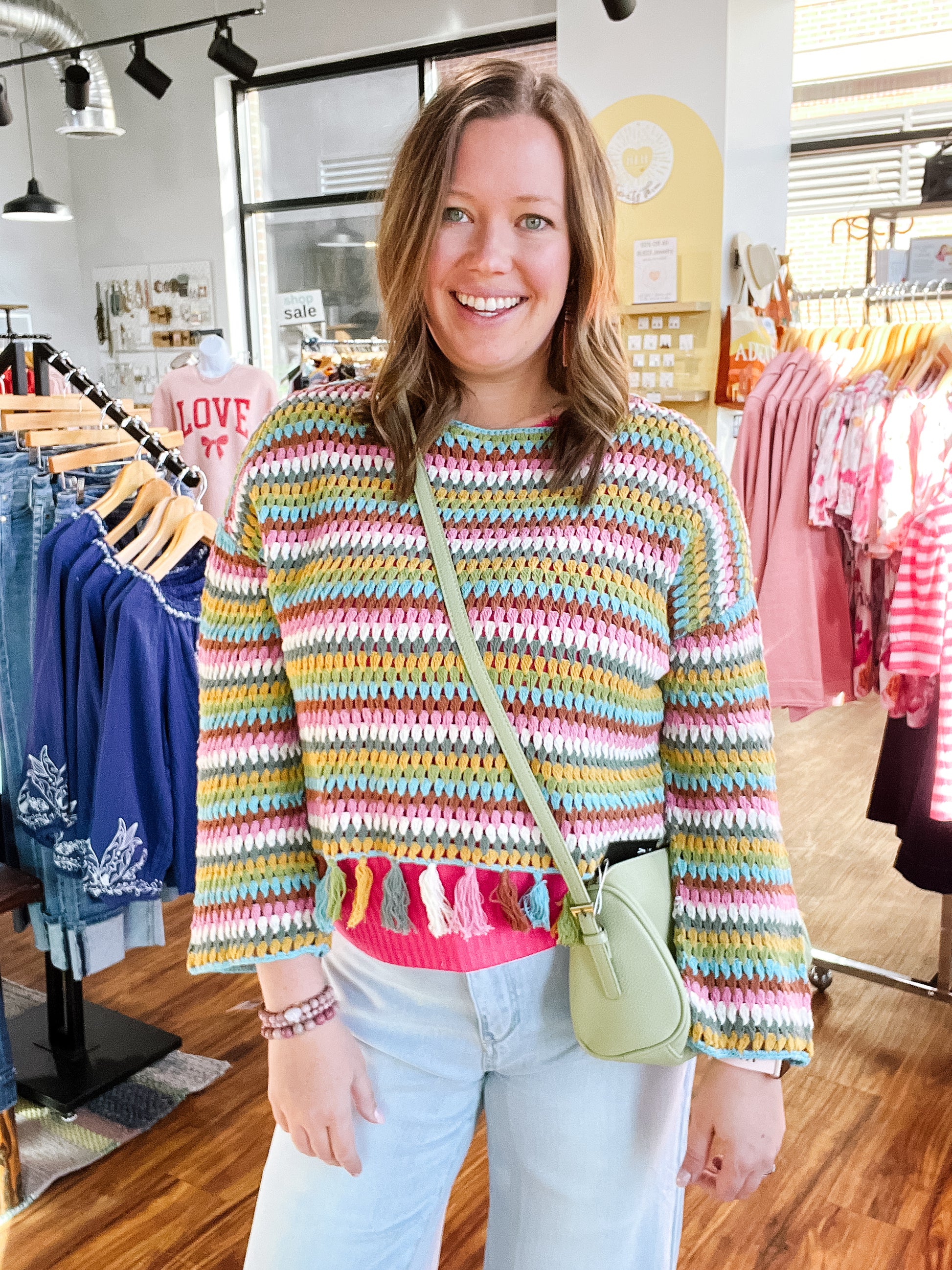 Product Description: This statement sweater features an open crochet knit in a beautiful blend of off-white, dusty pink, green, grey, gold, blue, and rust tones. Designed with a classic round neckline and long sleeves, it’s finished with playful fringe tassels along the hem for added texture and movement. Lightweight with an airy feel, this piece is perfect for layering over tanks or dresses and adds a fun, boho touch to any outfit.