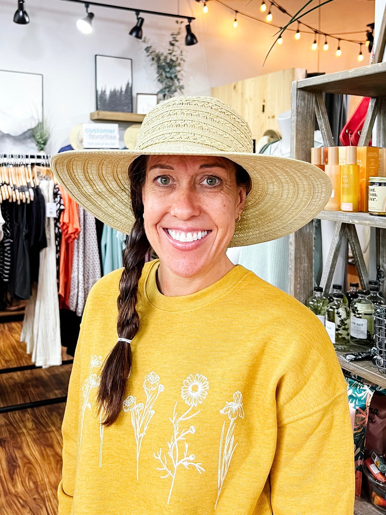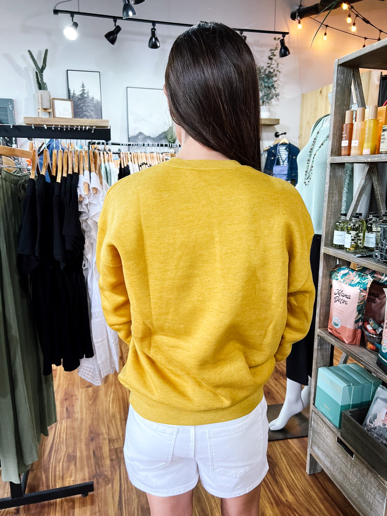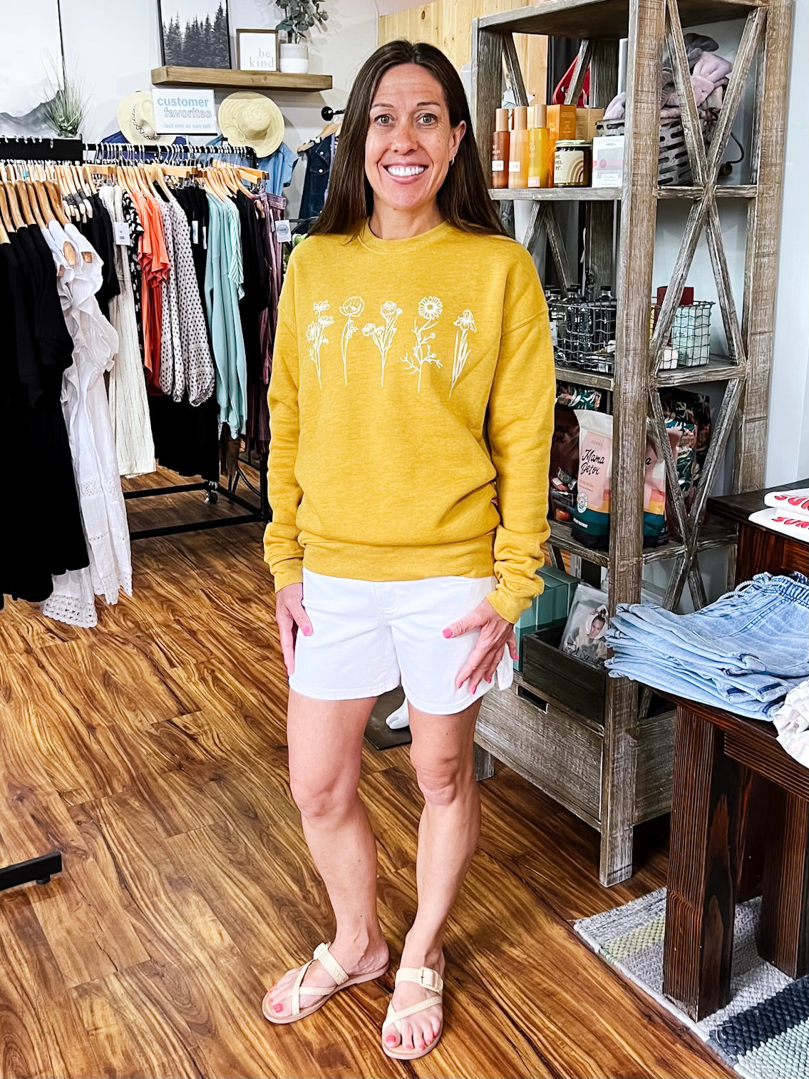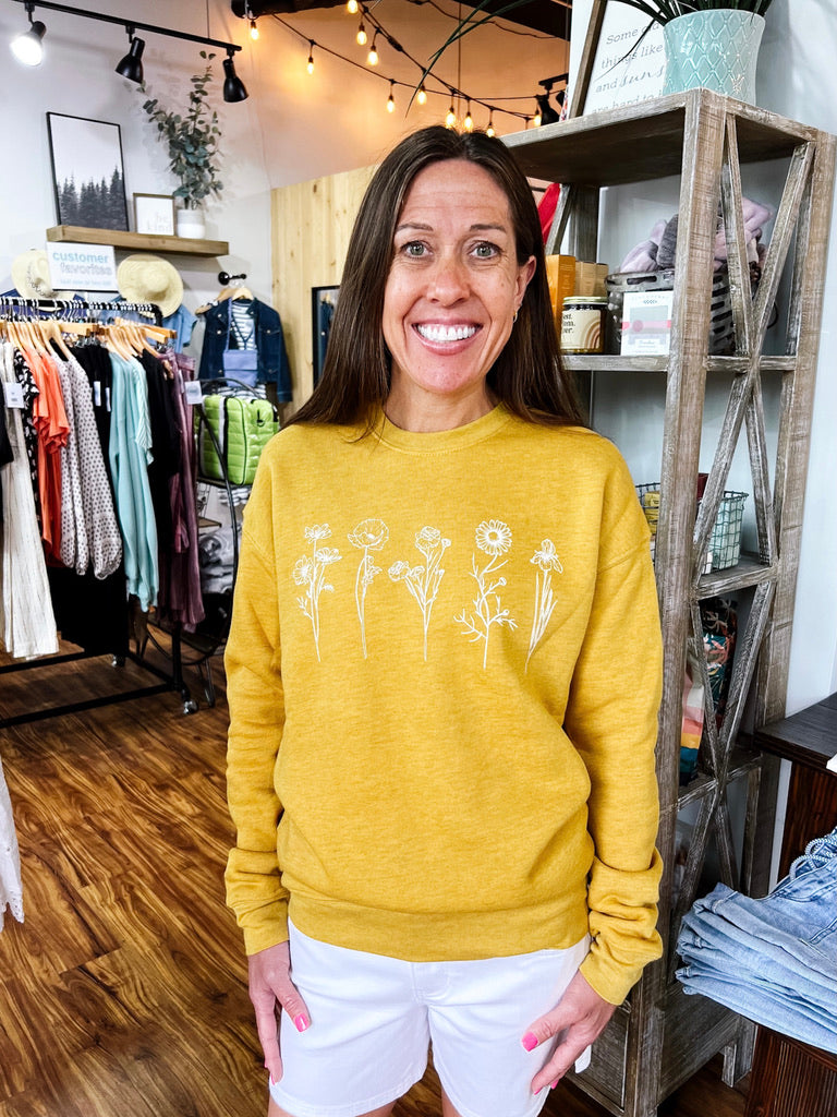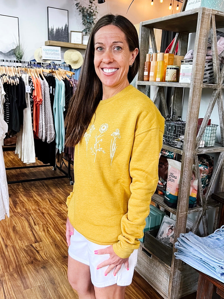Product Description: This mustard yellow crewneck sweatshirt features a charming white wildflower design across the front. Made from an ultra-soft fabric, it's cozy yet lightweight—perfect for cool mornings or laid-back weekends. A sweet and sunny layer for any casual look. Fits true to size.