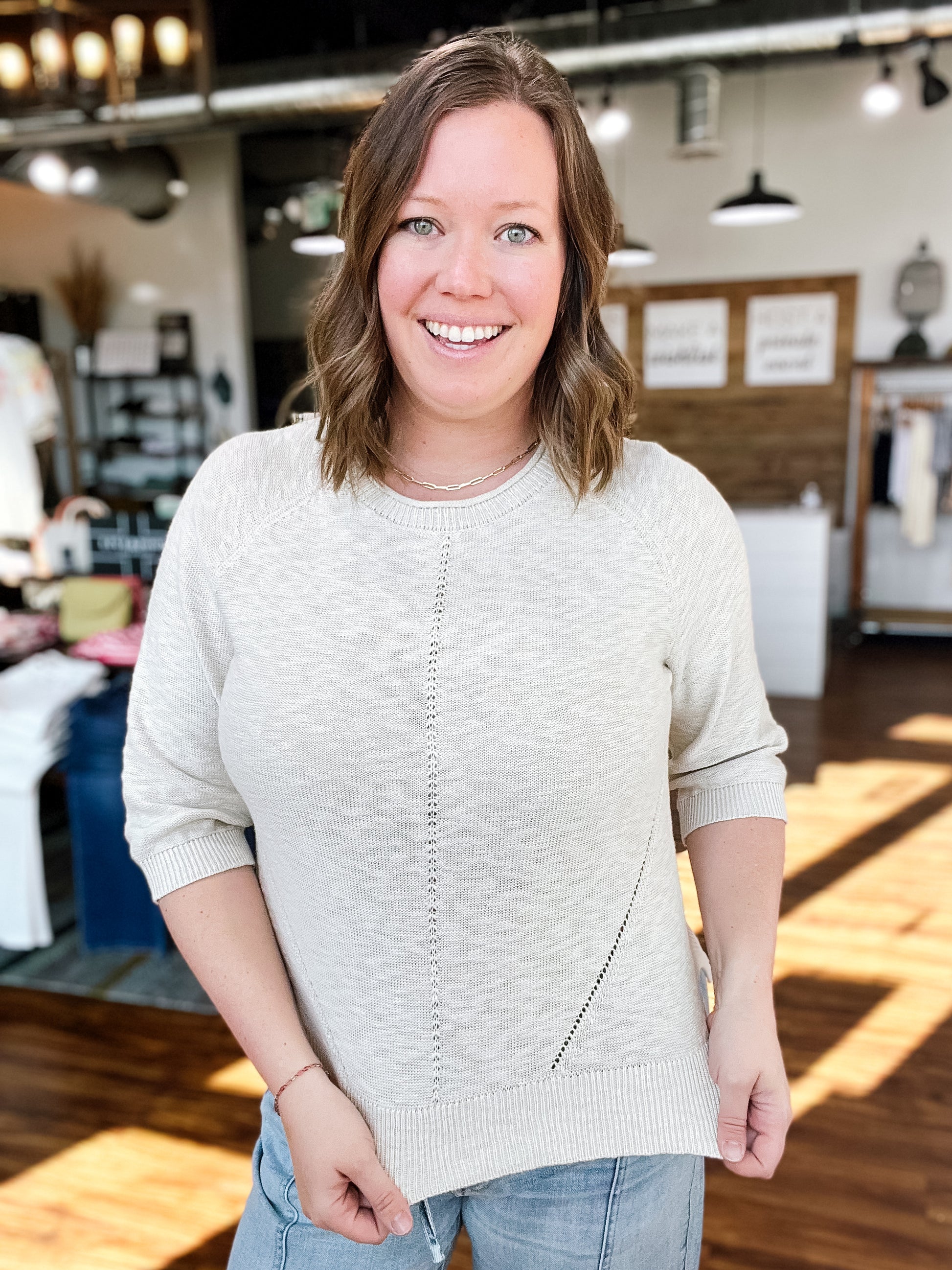 Product Description: A timeless staple, this natural 3/4 sleeve sweater is effortlessly versatile and easy to wear. Designed with a classic round neckline and beautiful stitch detailing, it adds subtle texture and interest while maintaining a clean, polished look. The 3/4 sleeves make it perfect for layering or wearing on its own through multiple seasons. Pair it with denim, trousers, or skirts for an easy everyday outfit.