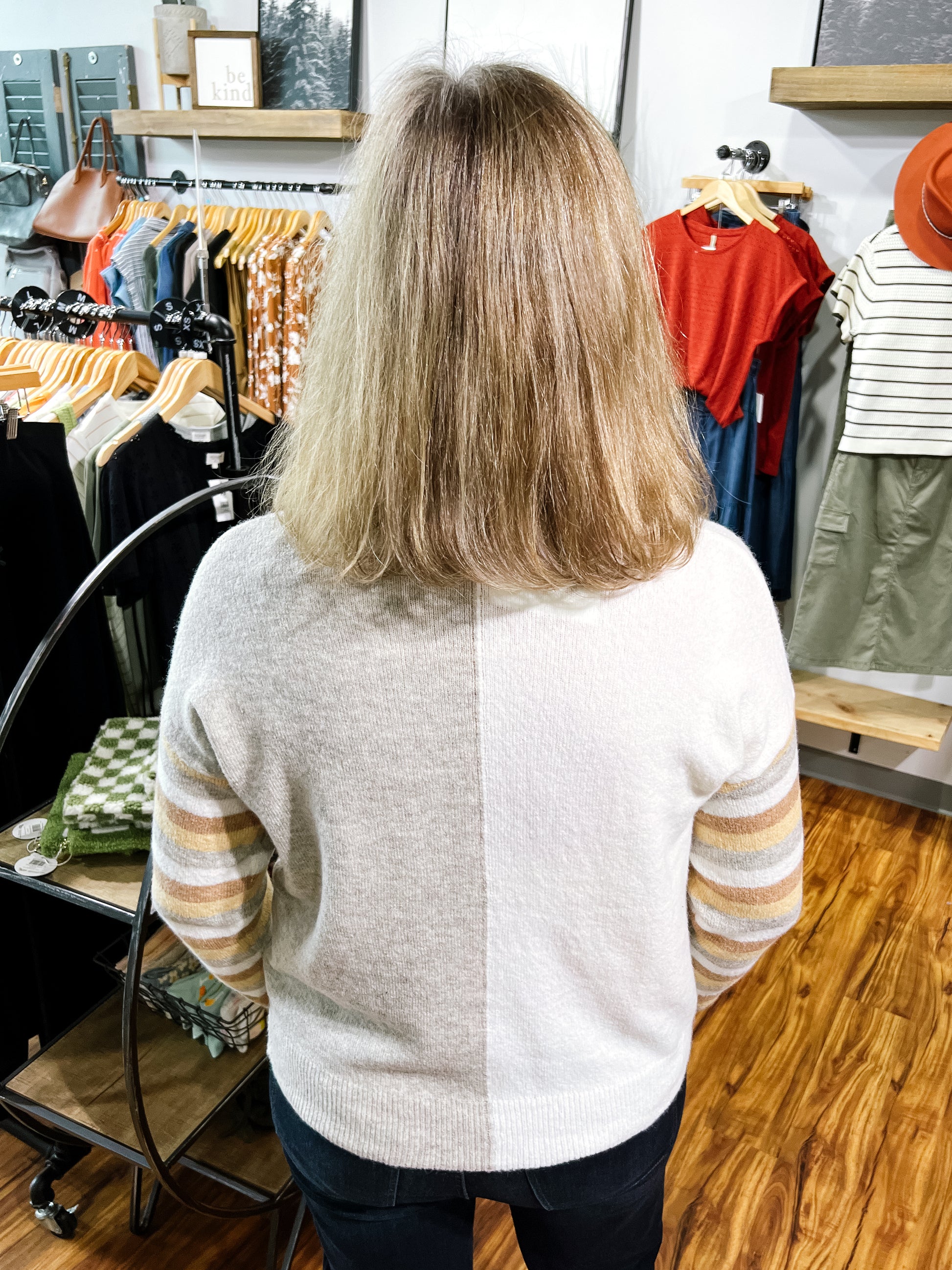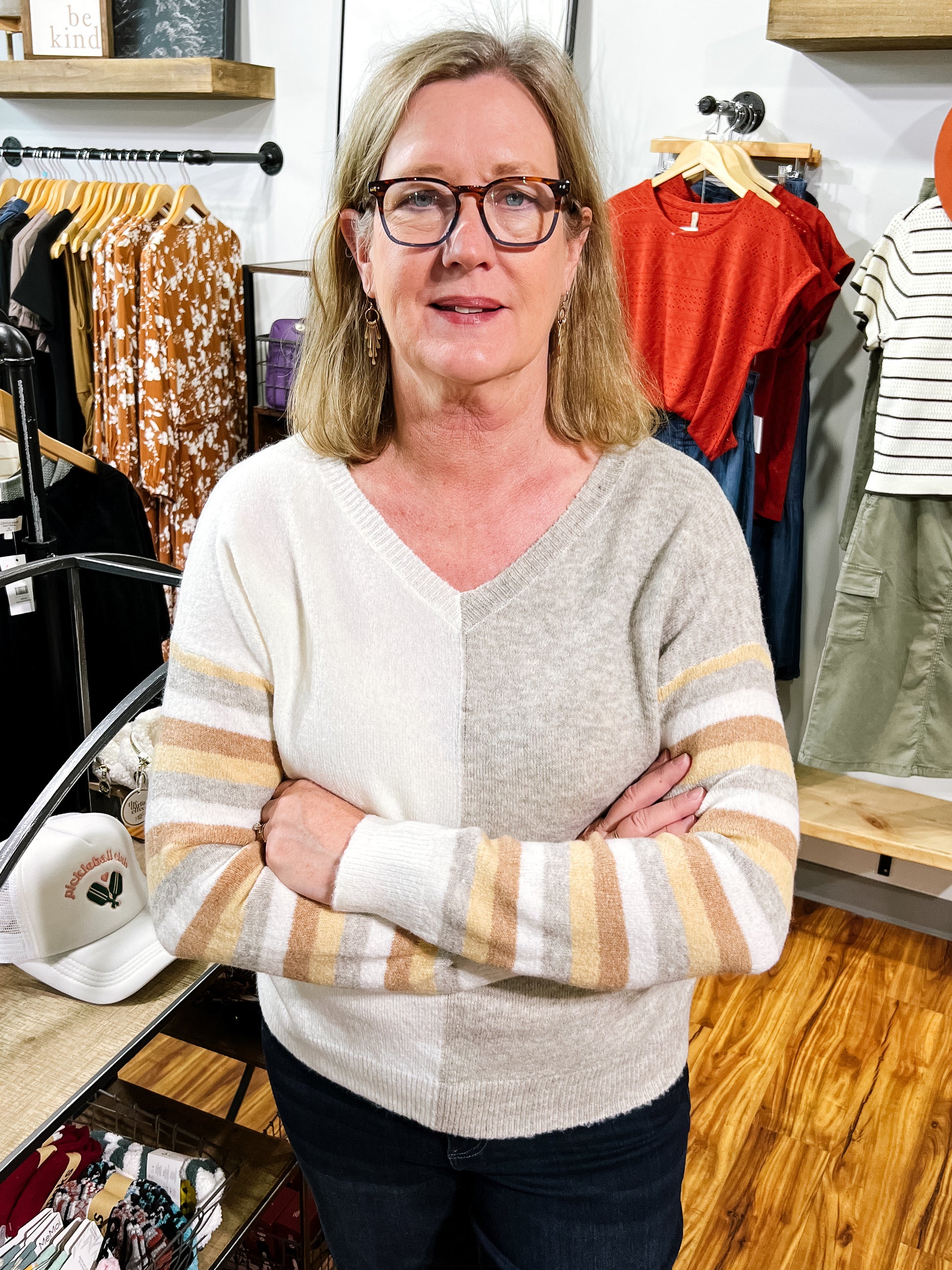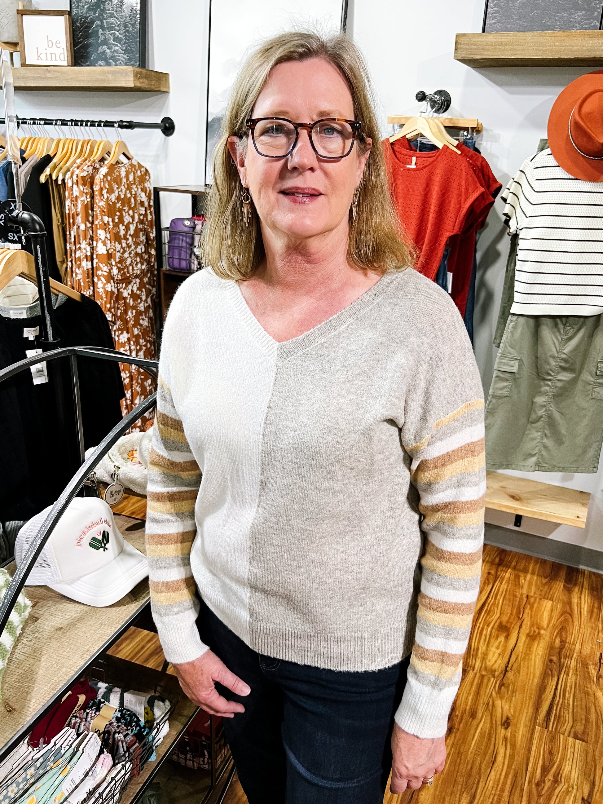 Product Description: A chic mix of camel, cream, and gold creates a timeless color block and stripe design on this cozy V-neck sweater. Soft and versatile, it’s the perfect piece to dress up with trousers or keep casual with denim.