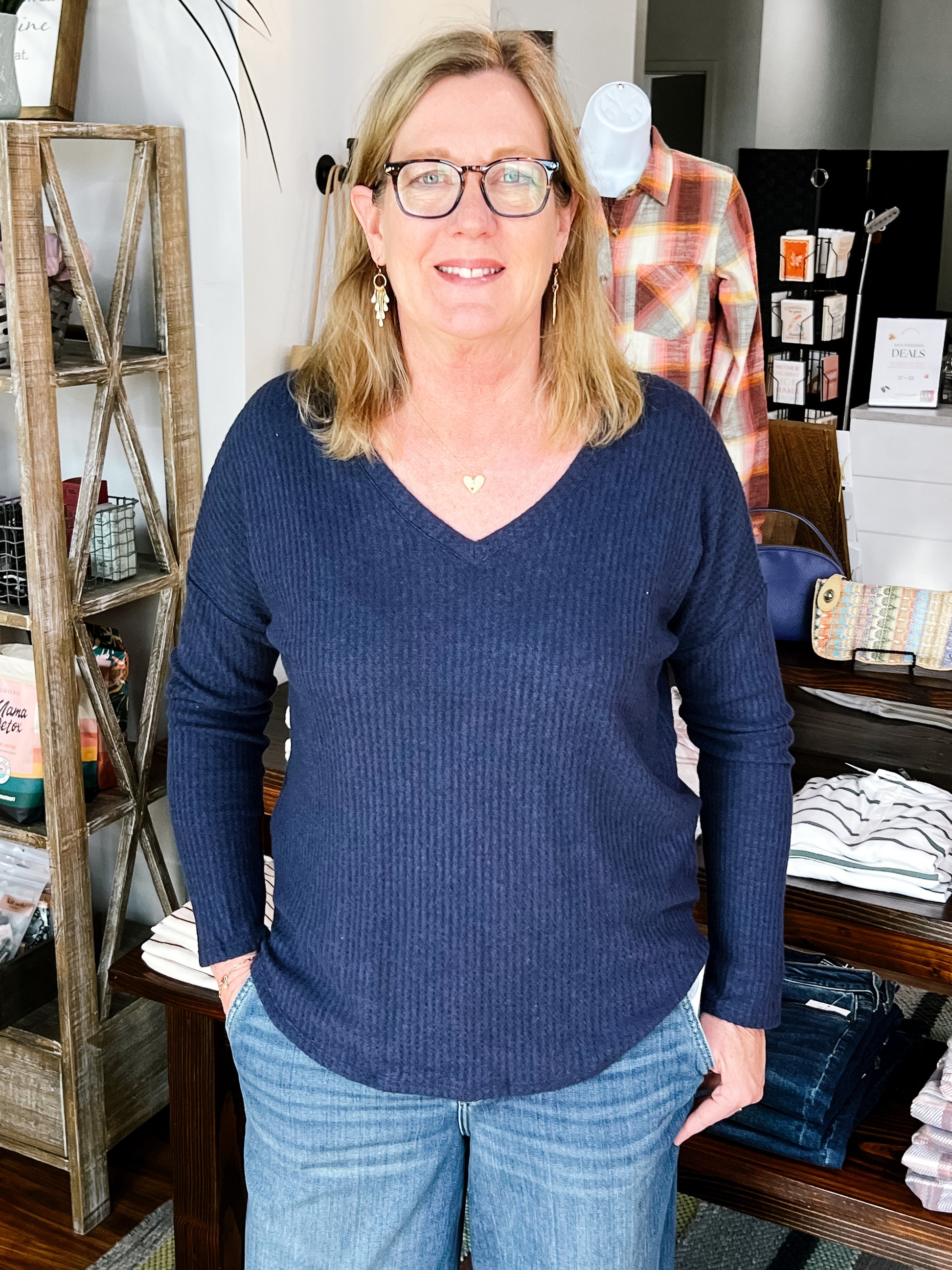 Product Description: This lightweight navy V-neck sweater features a subtle thermal pattern and an ultra-soft feel. Easy to layer or wear on its own, it's a cozy go-to for transitional weather.