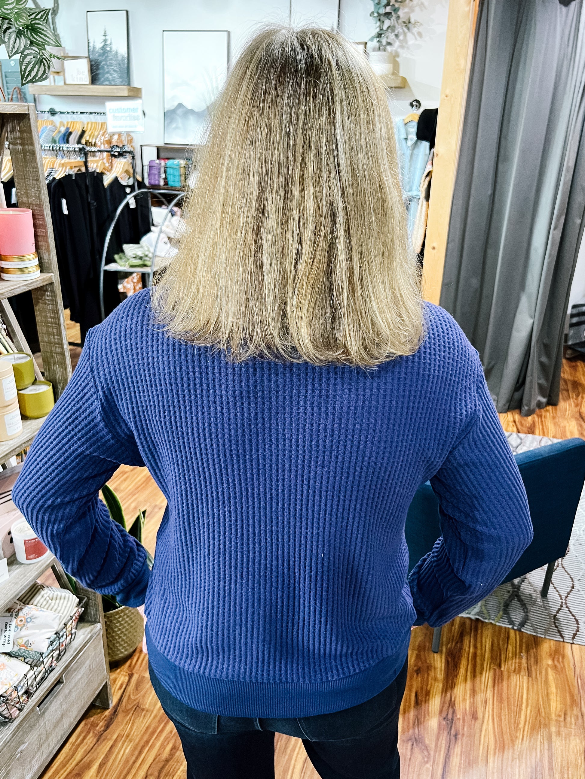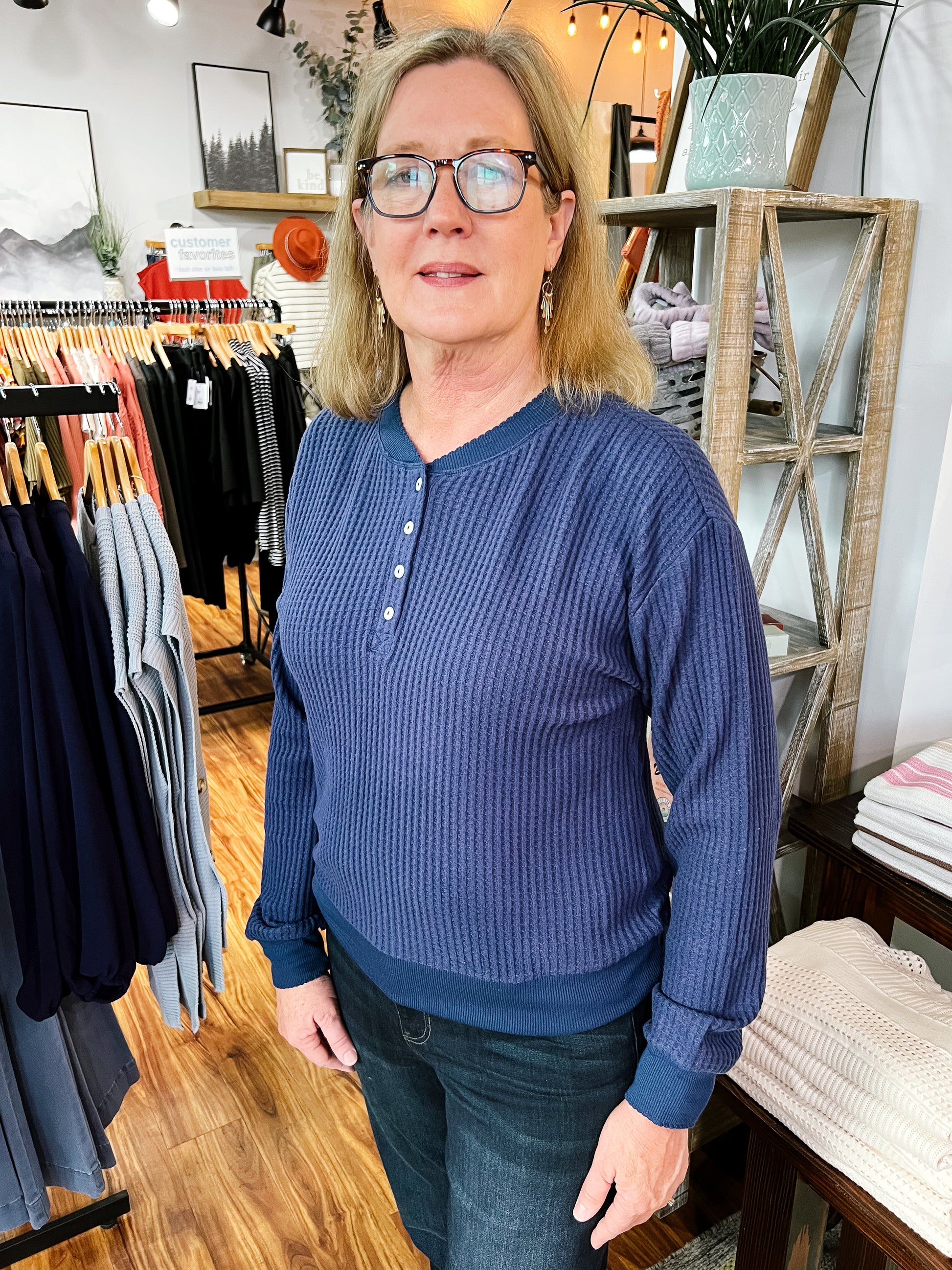 Product Description: A perfect closet basic, this navy waffle weave top features a ¼ button placket with banded neckline, cuffs, and waist. Soft, versatile, and easy to layer, it’s a go-to piece for everyday wear.