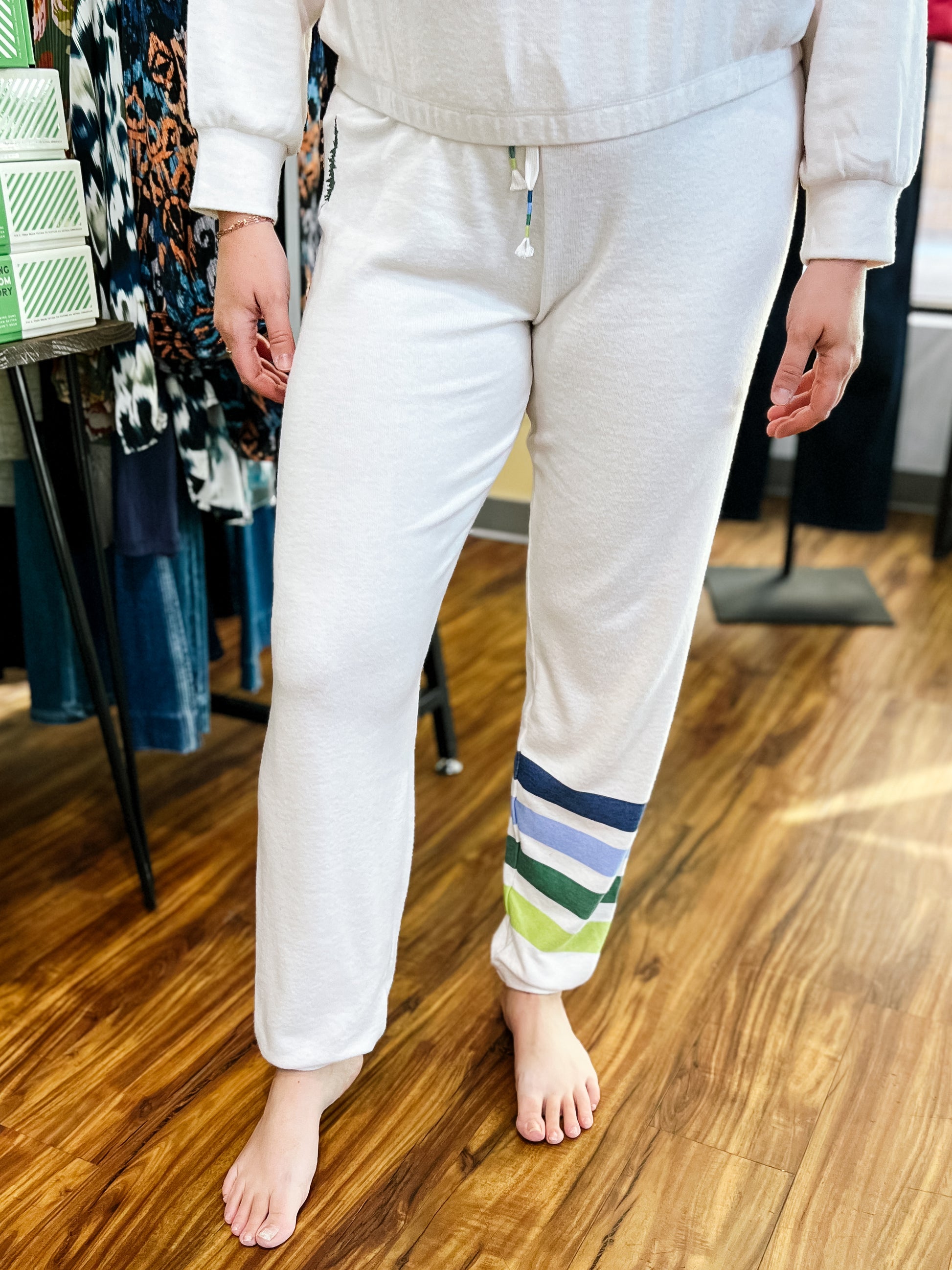 Product Description: These ultra-soft oatmeal joggers feature a machine-embroidered tree on the hip and playful blue and green stripes down one leg, adding a fun, outdoorsy touch. With a drawstring waistband, decorative stitching on the ties, a 10" rise, and a 30" inseam, they offer a relaxed, comfy fit. Pair them with the matching Outsider hoodie for a coordinated, cozy set perfect for lounging, casual days, or weekend adventures.
