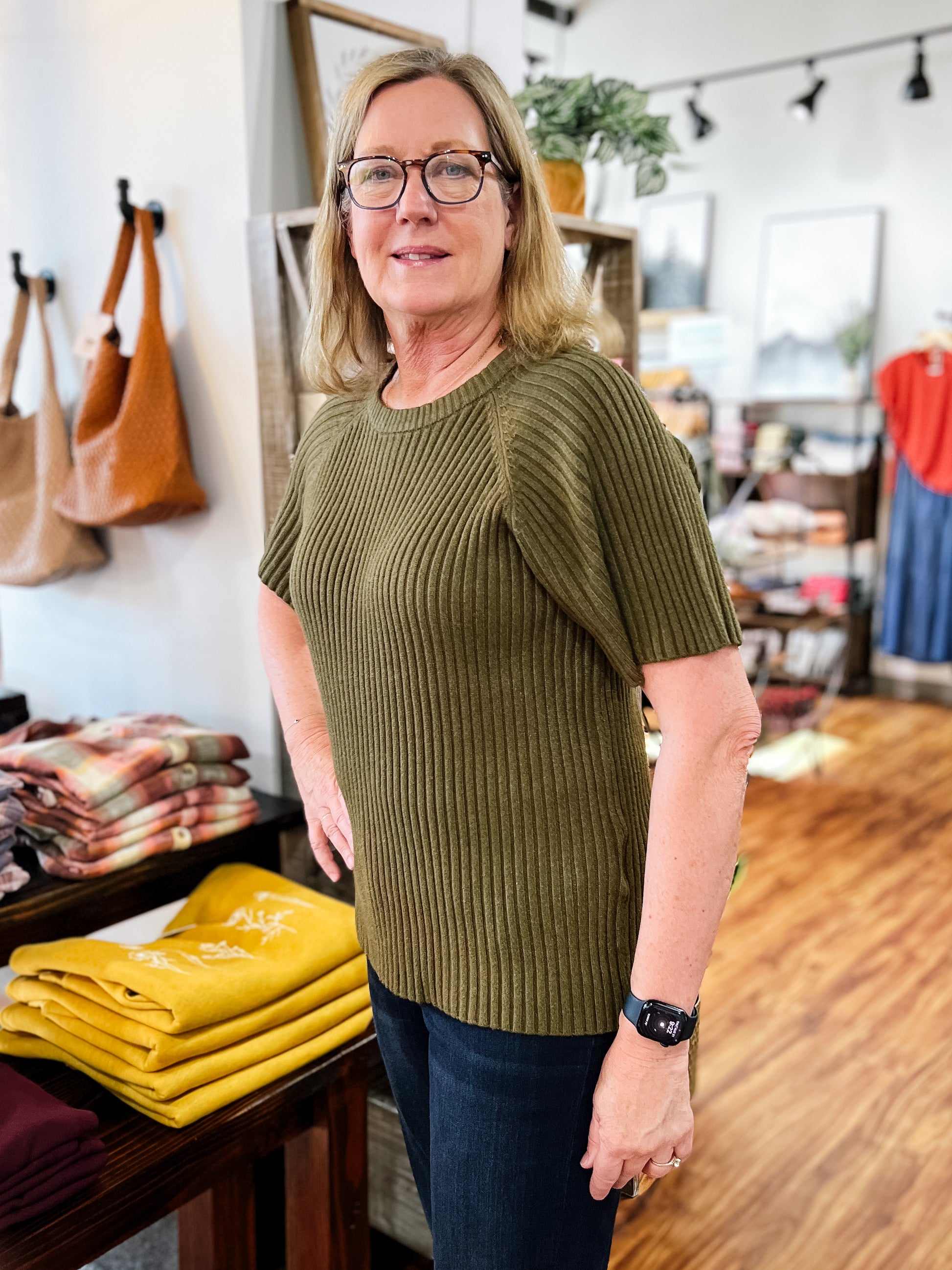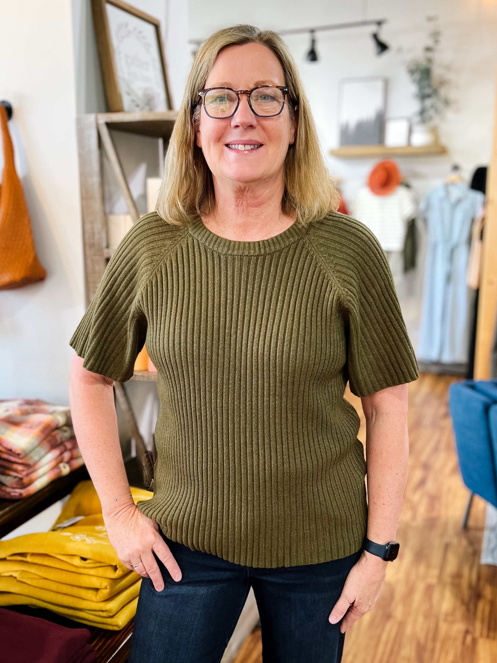 Product Description: This chunky olive green sweater features a thick, round neckline and a large ribbed texture for a cozy, structured look. Short sleeves make it perfect for layering or wearing on its own for a casual, polished outfit.