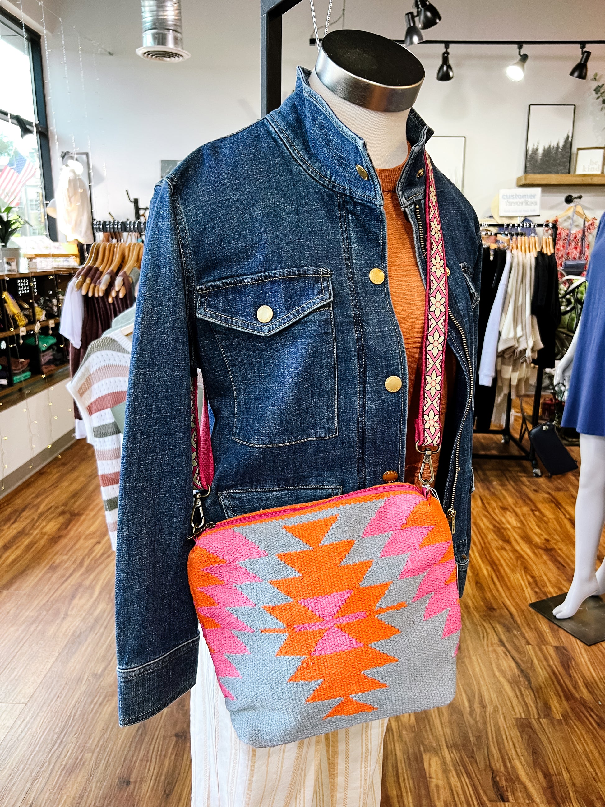 Product Description: This fun Aztec print crossbody adds personality to any outfit. It features a structured bottom so it stands on its own, and a removable strap with its own eye-catching floral design. Inside, you'll find a single zippered pocket to keep essentials secure. Also comes in a green and orange colorway!