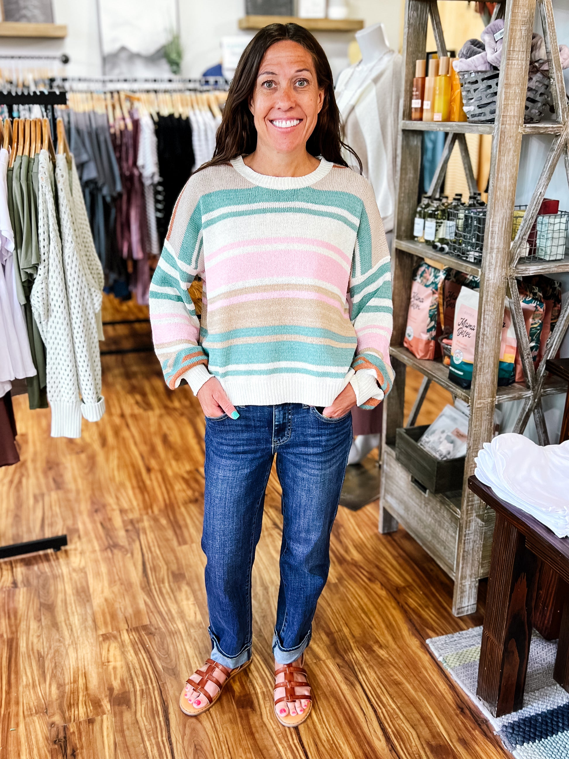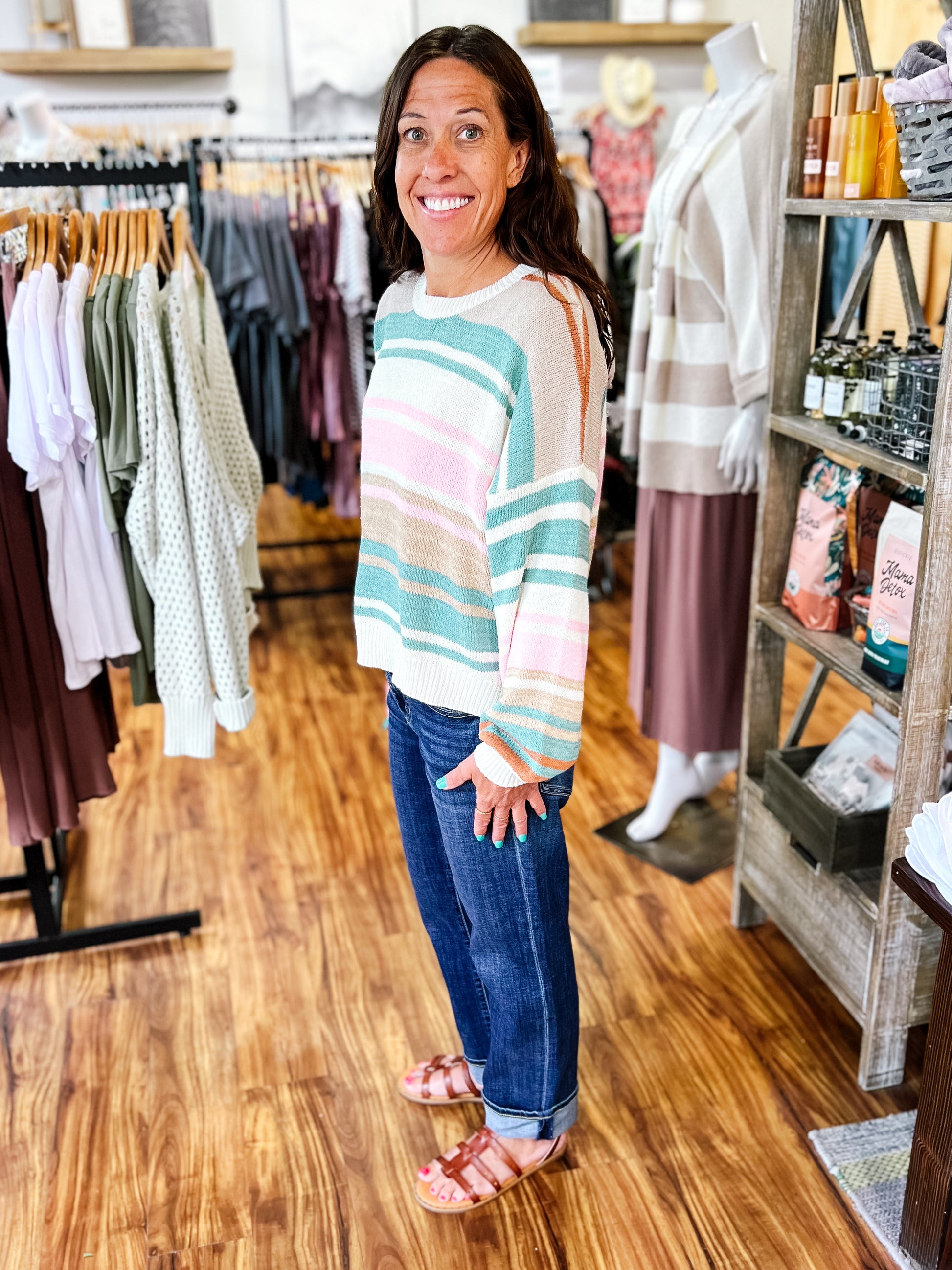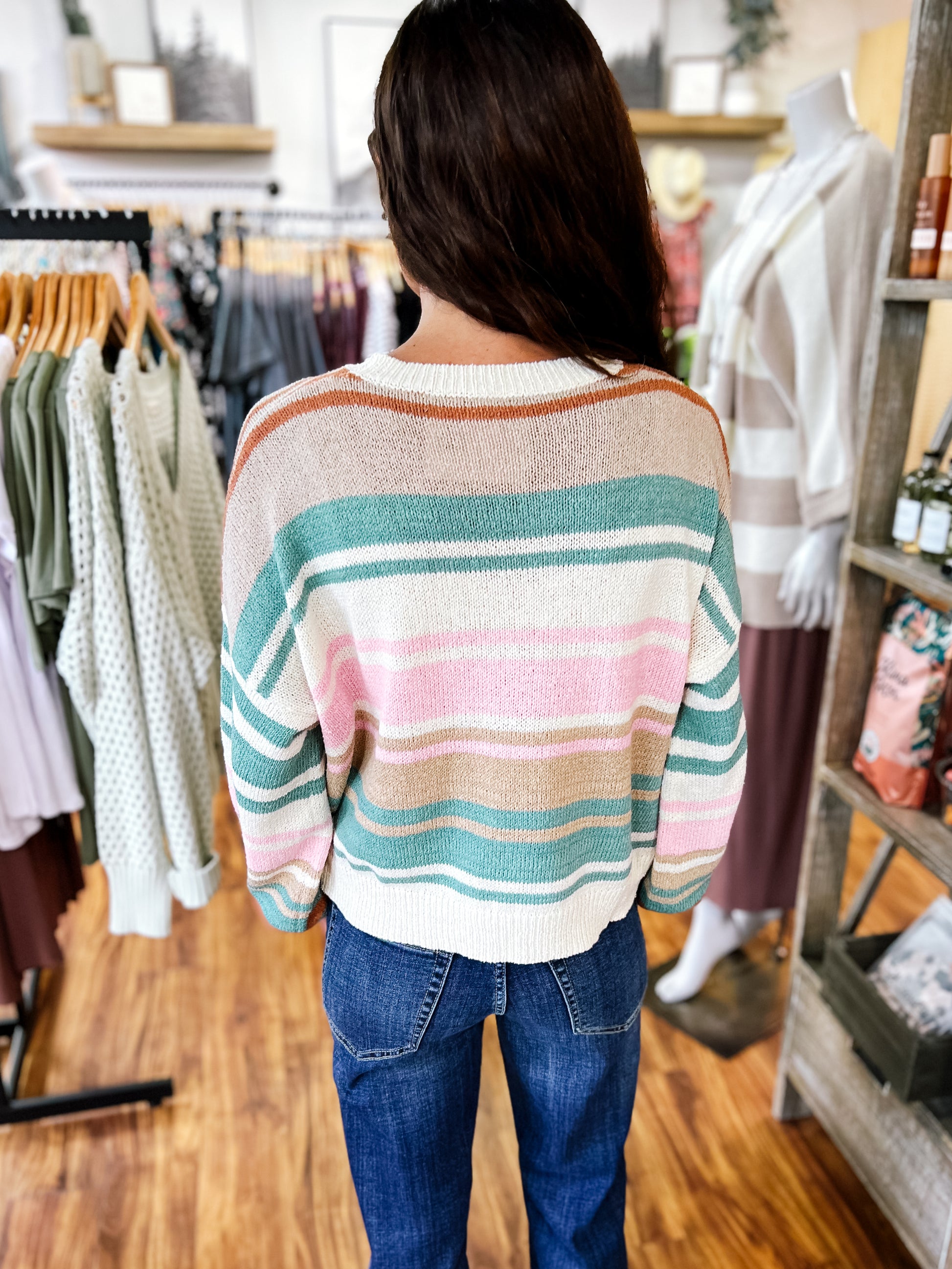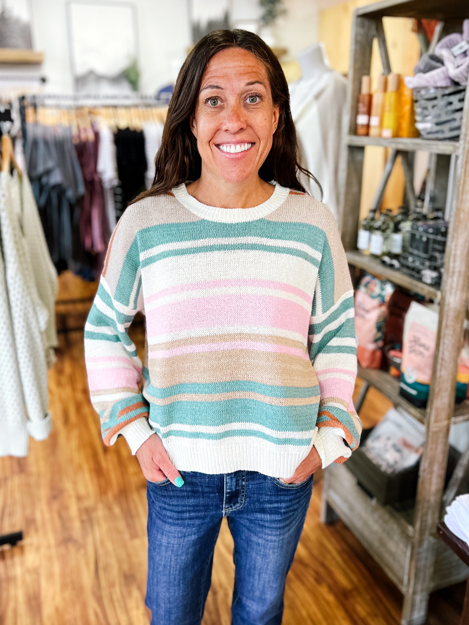 Product Description: This cozy sweater features bold stripes in pink, cream, teal, and brown for a playful yet earthy look. Designed with long balloon sleeves and a classic round neckline, it’s a fun statement piece that pairs perfectly with your favorite denim or neutral bottoms.