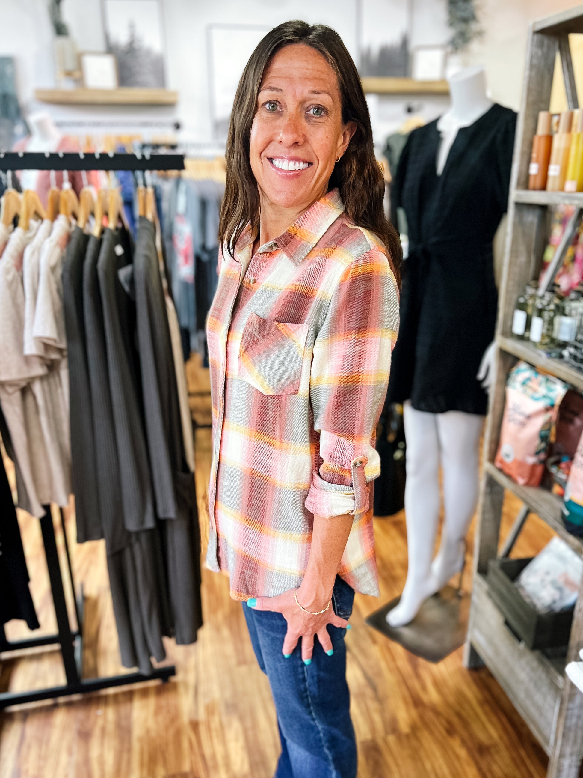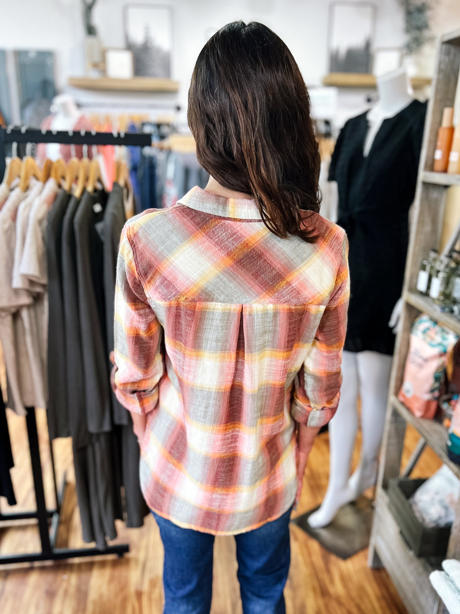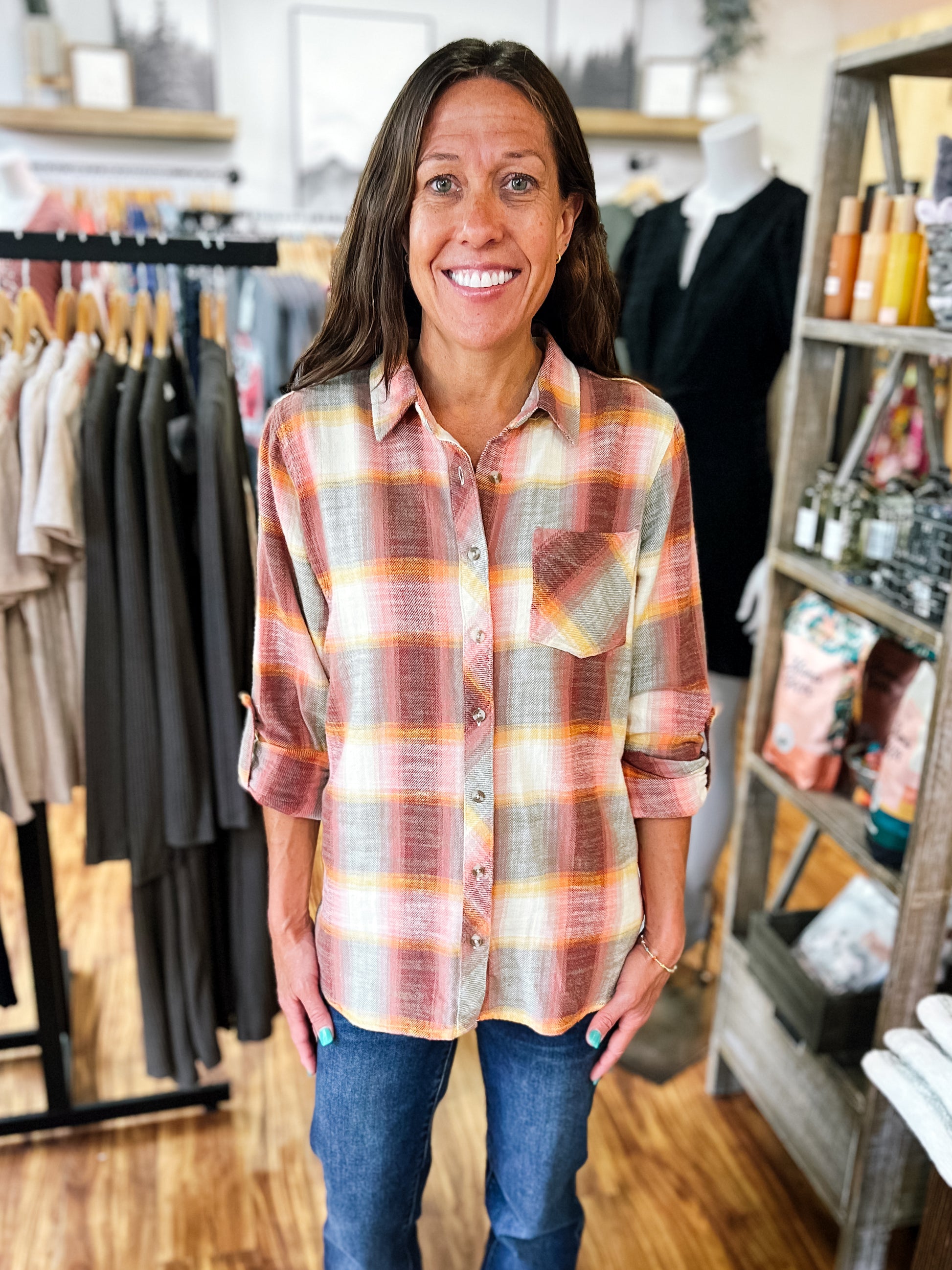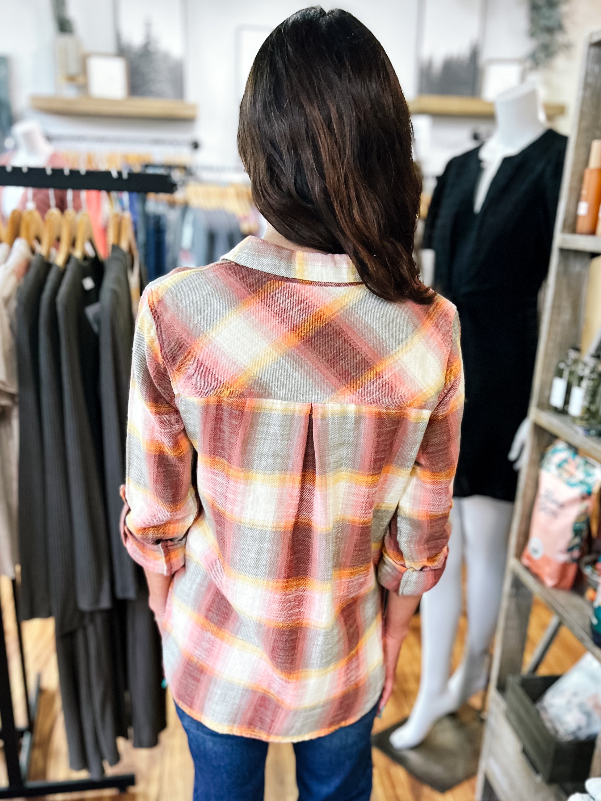 Product Description: A cozy classic with a pop of color—this orange, red, and cream flannel shirt features a single chest pocket and rolled tab sleeves for a relaxed, lived-in look.