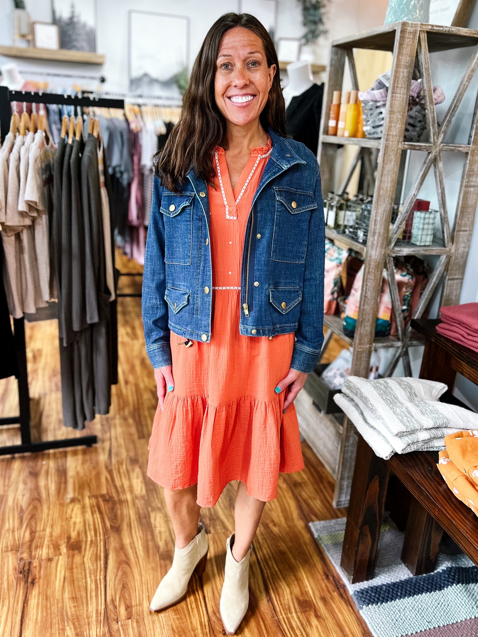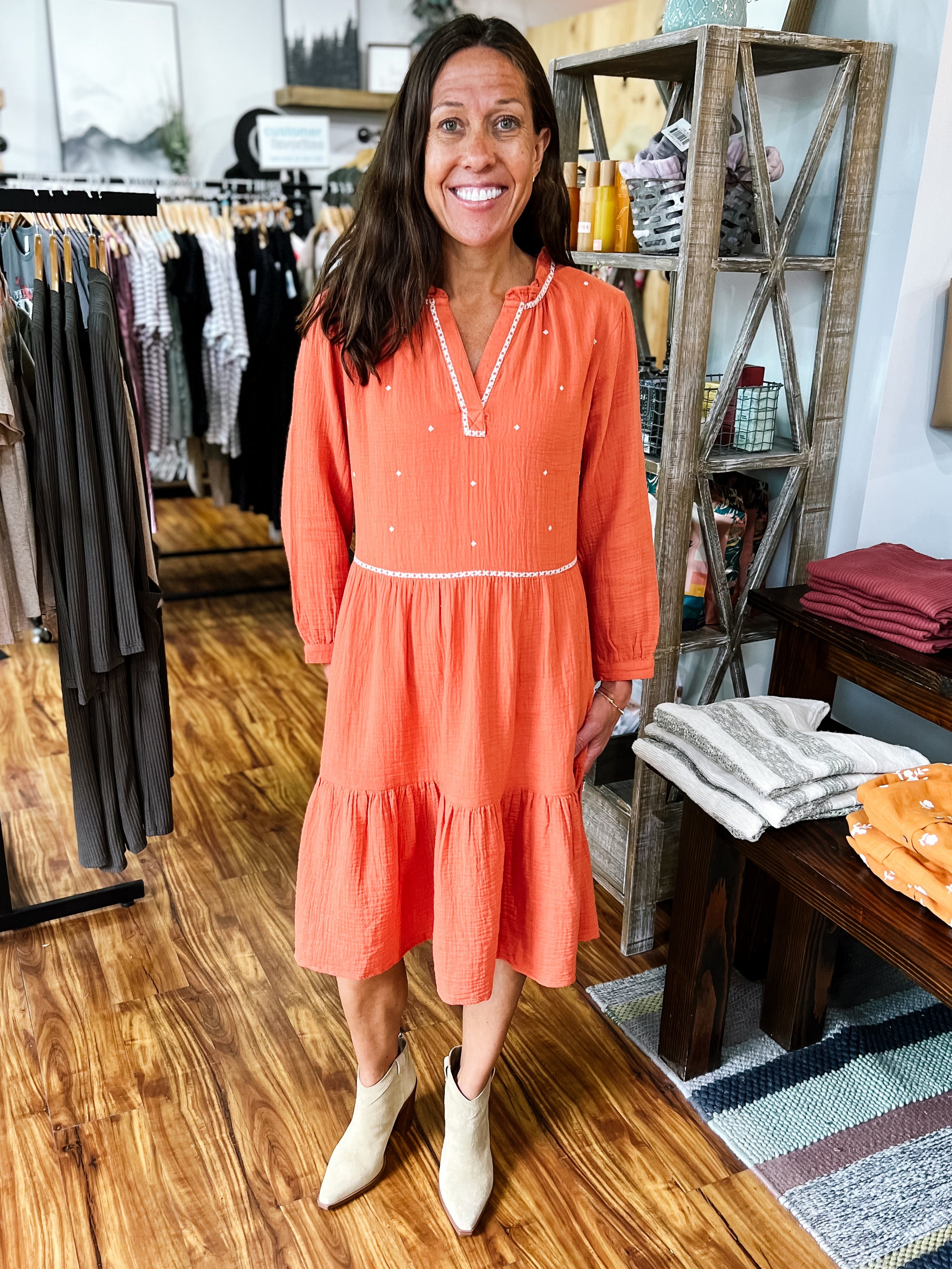 Product Description: Rust gauze tiered dress with a flowy silhouette and off-white stitch detailing. Features a 3/4 sleeve, v-neckline with ruffle collar, and hits right at the knee for an effortless, feminine look.