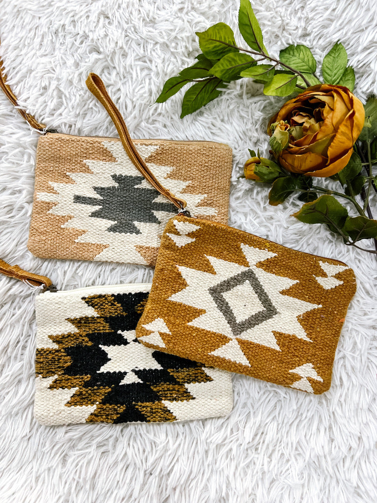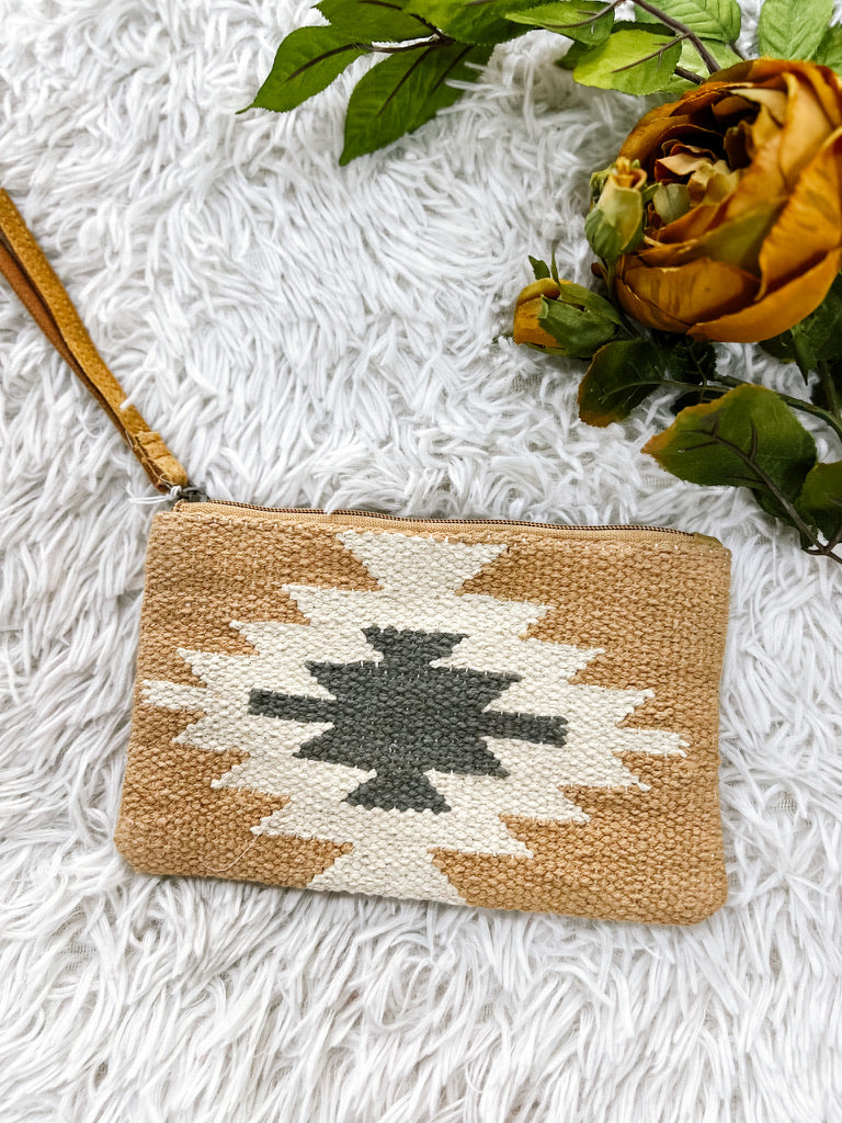 Product Description: This woven Aztec print wristlet is both stylish and practical. Featuring a leather pull and fully lined interior, it’s perfect for organizing smaller items in a larger tote or carrying on its own for a quick grab-and-go bag. Available in three colorways!