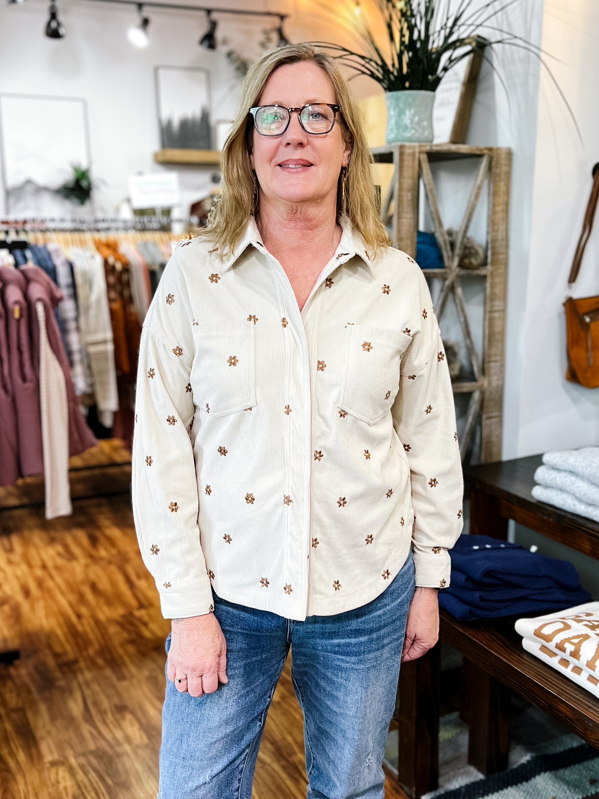 Product Description: A medium-weight tan corduroy shirt with a charming floral print that brings a touch of femininity to a classic style. Designed with two front breast pockets, button snap front closure, and snap cuffs at the wrists for easy wear. Soft with just the right amount of structure, this piece can be worn buttoned up as a shirt or layered open as a casual shacket—perfect for transitioning seasons in style.