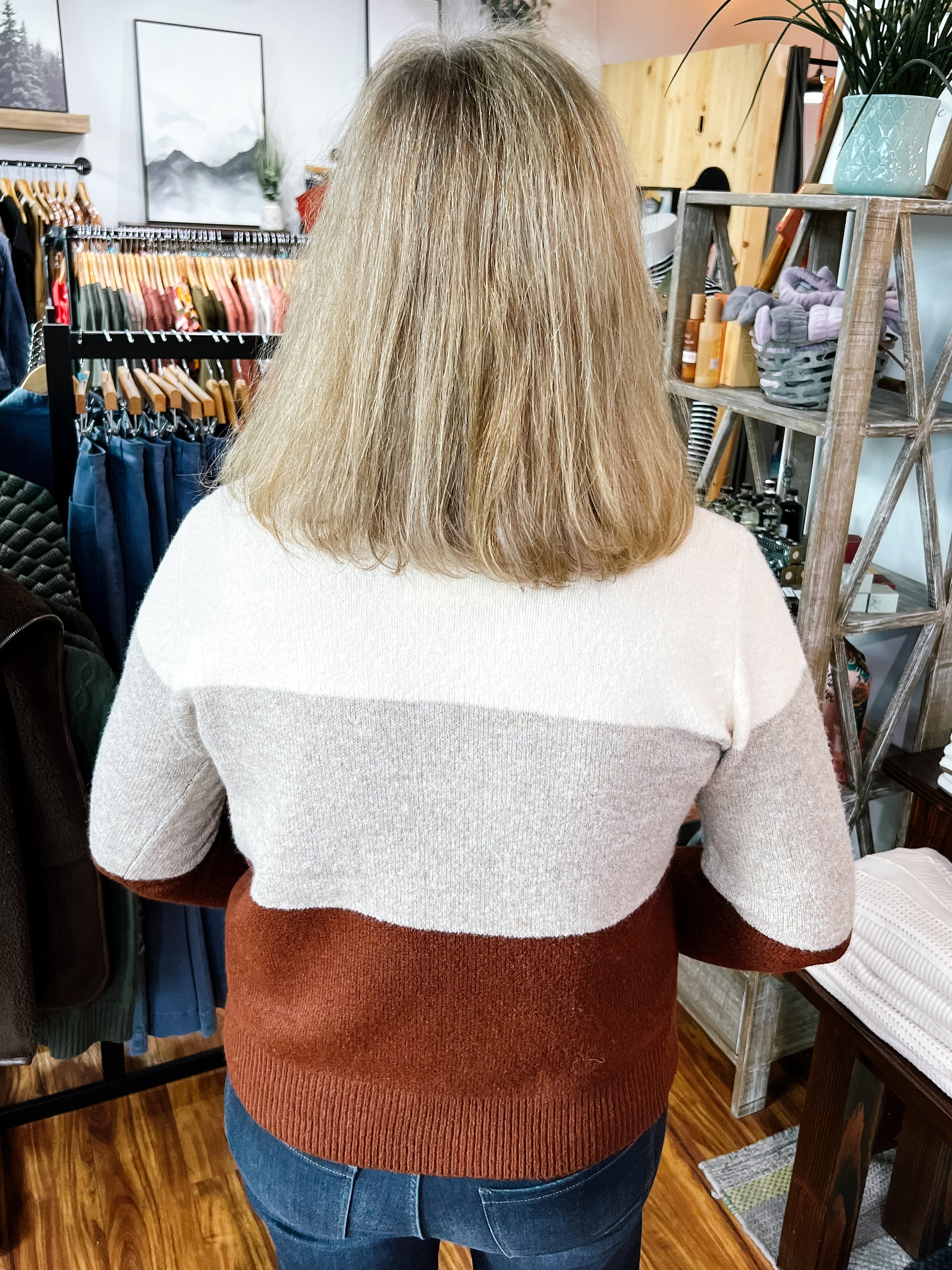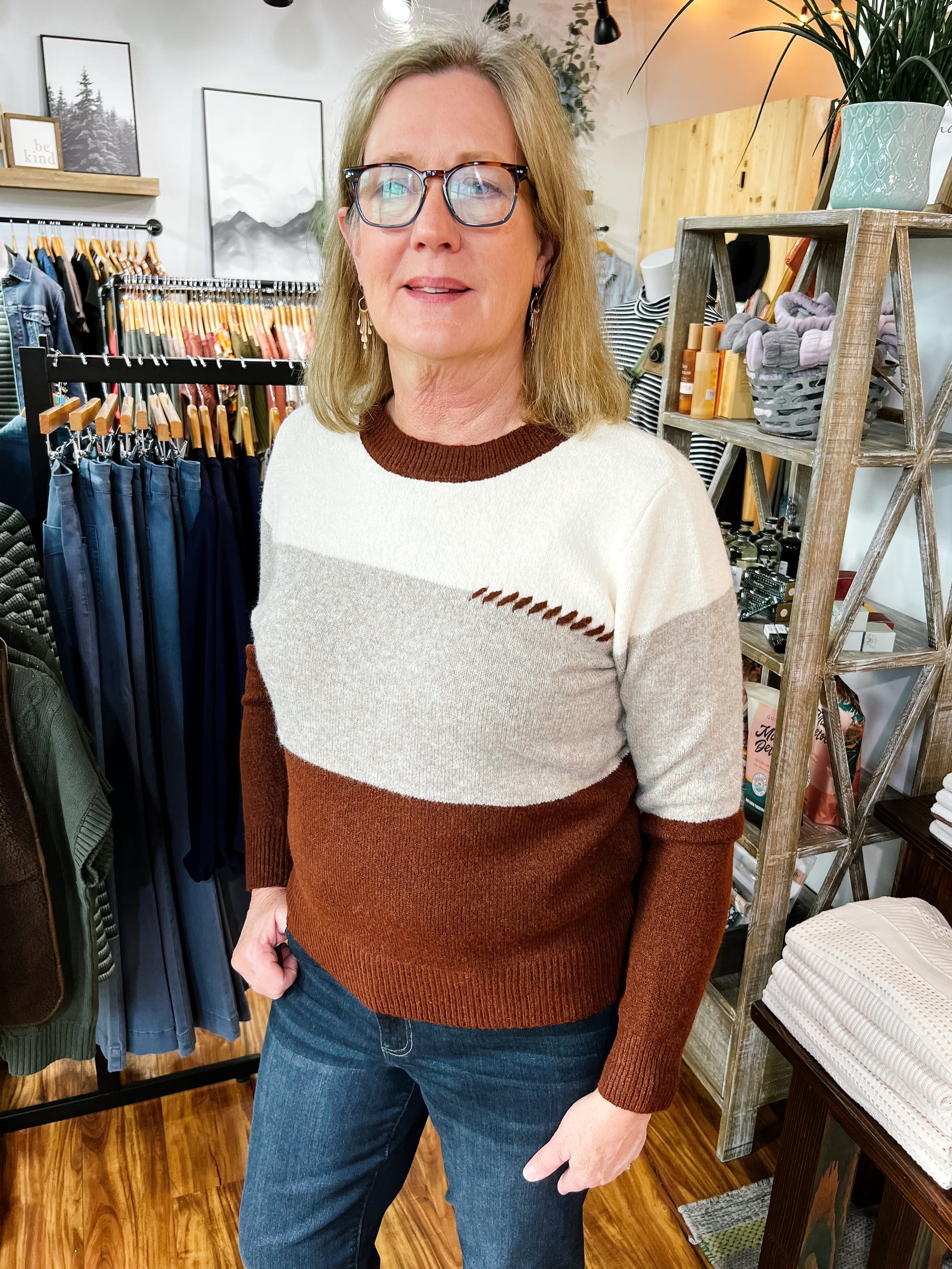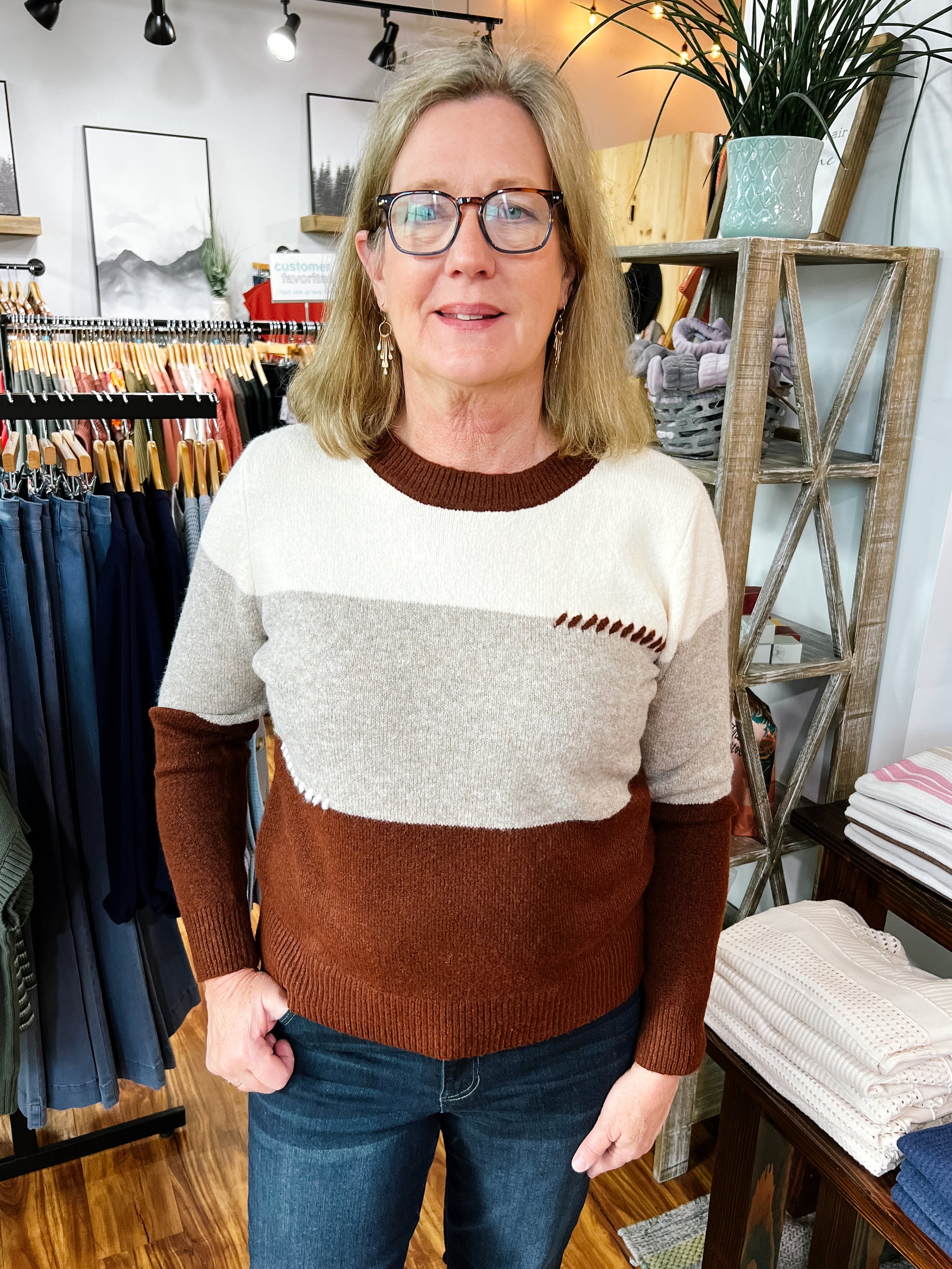 Product Description: A timeless color block design in taupe, cream, and brown, this crewneck sweater offers classic styling and effortless versatility for any wardrobe.