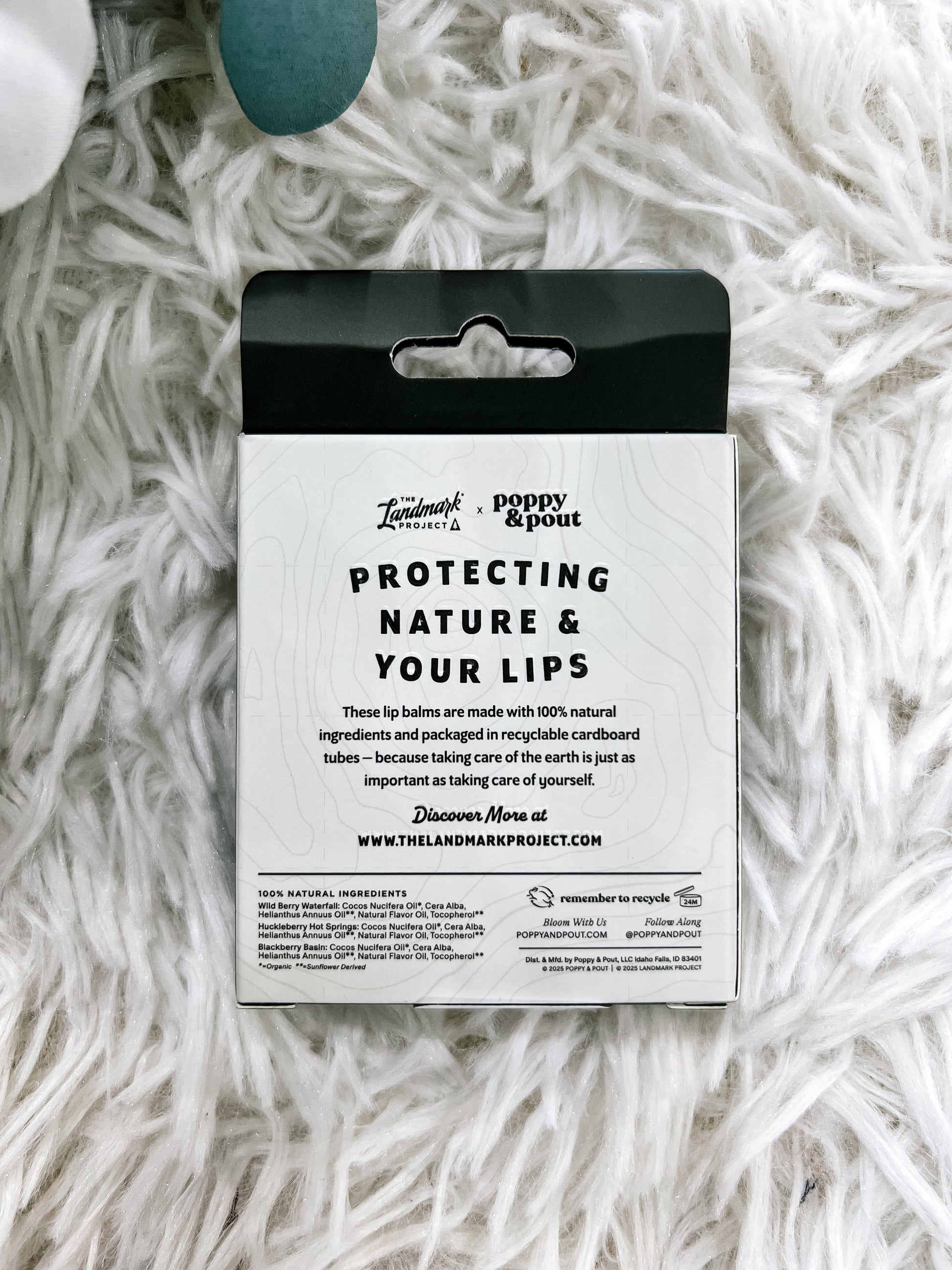 The Mountain trio comes with three lip balms, Mount Rainier Blackberry Basin, Yellowstone Huckleberry Hot Springs, and Yosemite Wild Berry Waterfall.