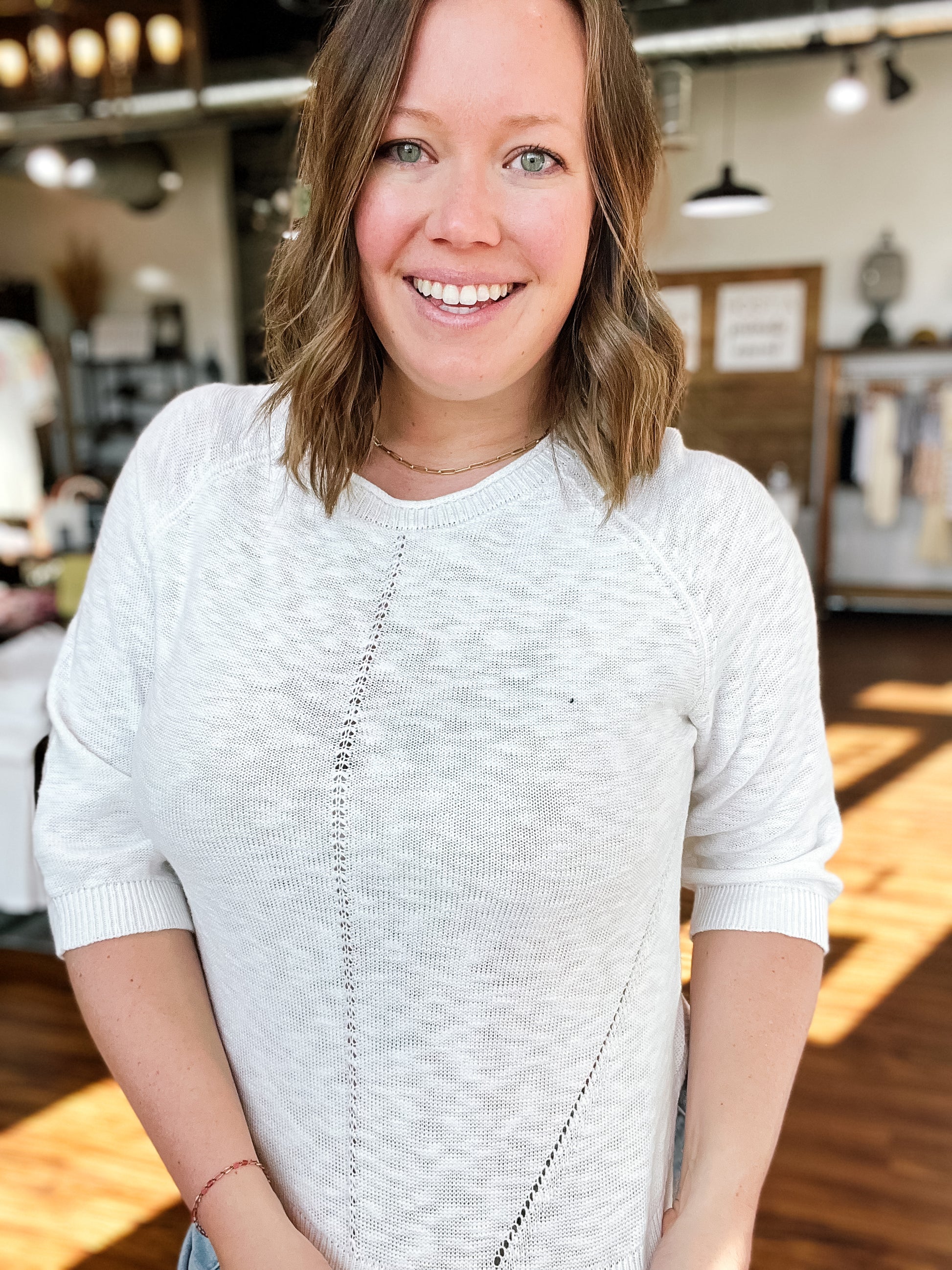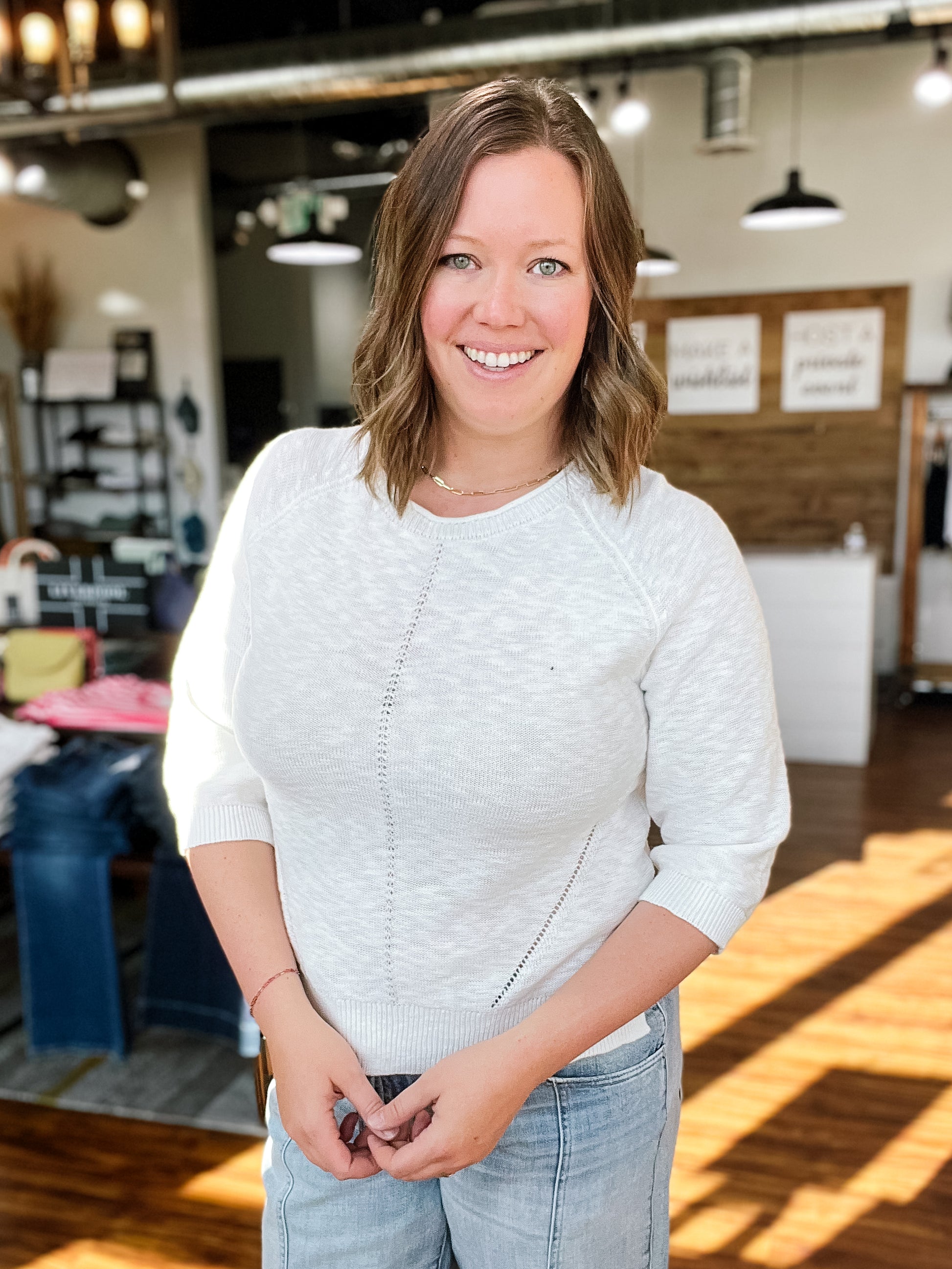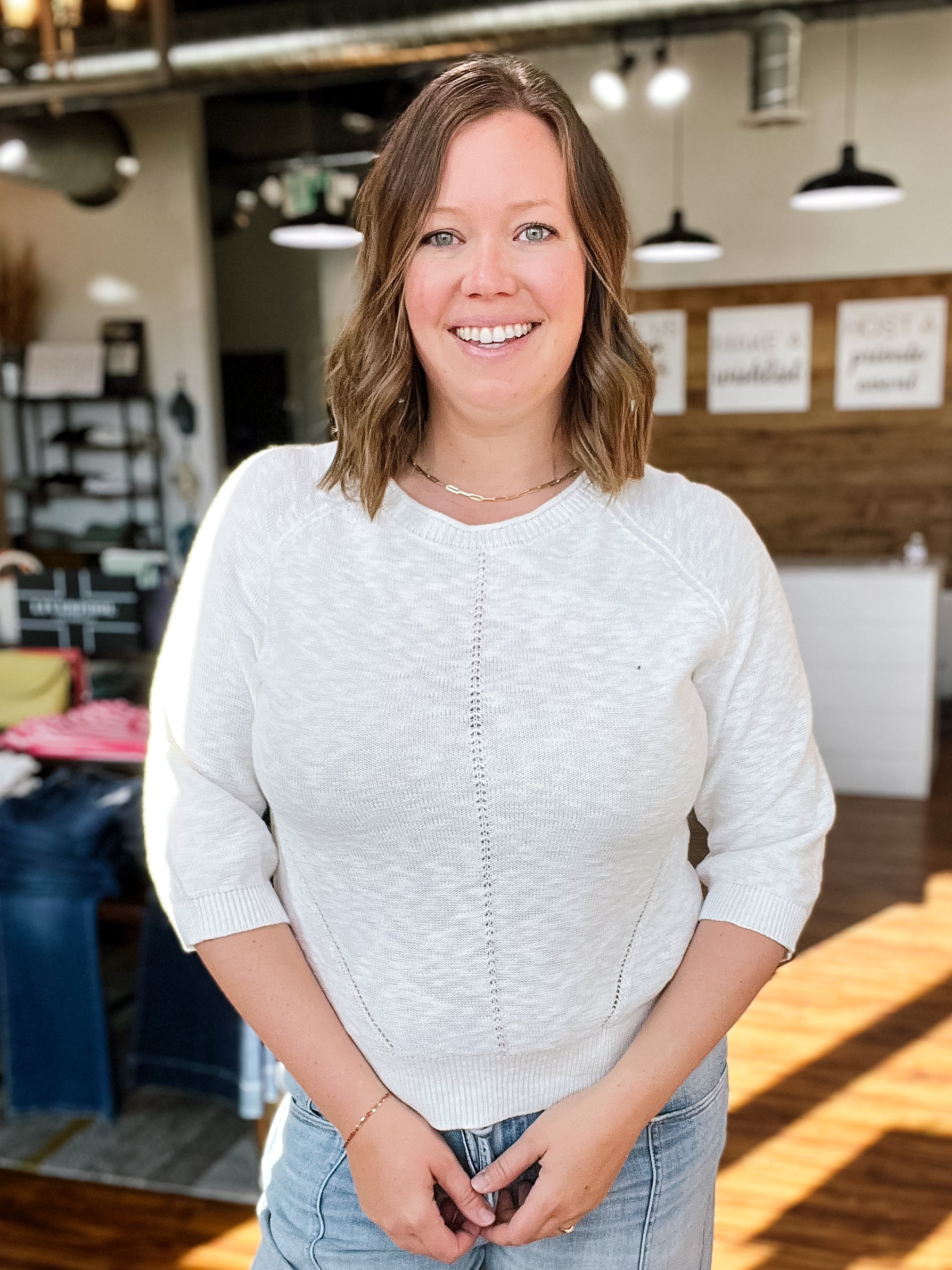 Product Description: A timeless staple, this white 3/4 sleeve sweater is effortlessly versatile and easy to wear. Designed with a classic round neckline and beautiful stitch detailing, it adds subtle texture and interest while maintaining a clean, polished look. The 3/4 sleeves make it perfect for layering or wearing on its own through multiple seasons. Pair it with denim, trousers, or skirts for an easy everyday outfit.