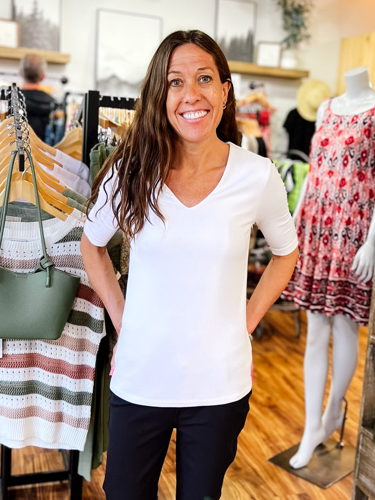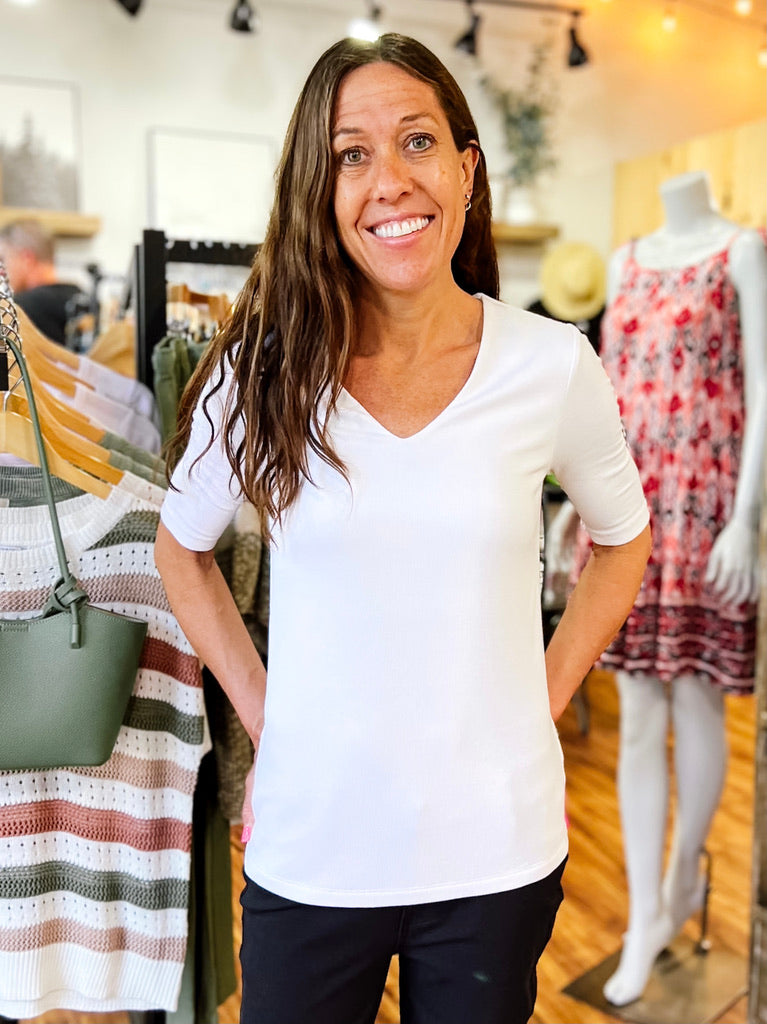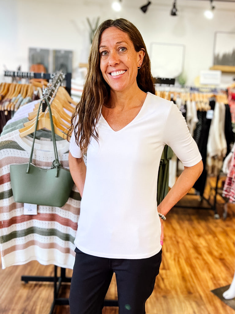 Product Description: If you love this top in black, you’ll definitely want it in white too. This fitted V-neck features narrow ribbing and just the right amount of stretch. The perfect piece to wear on its own or layered under your favorite jacket or cardigan. Fits true to size.