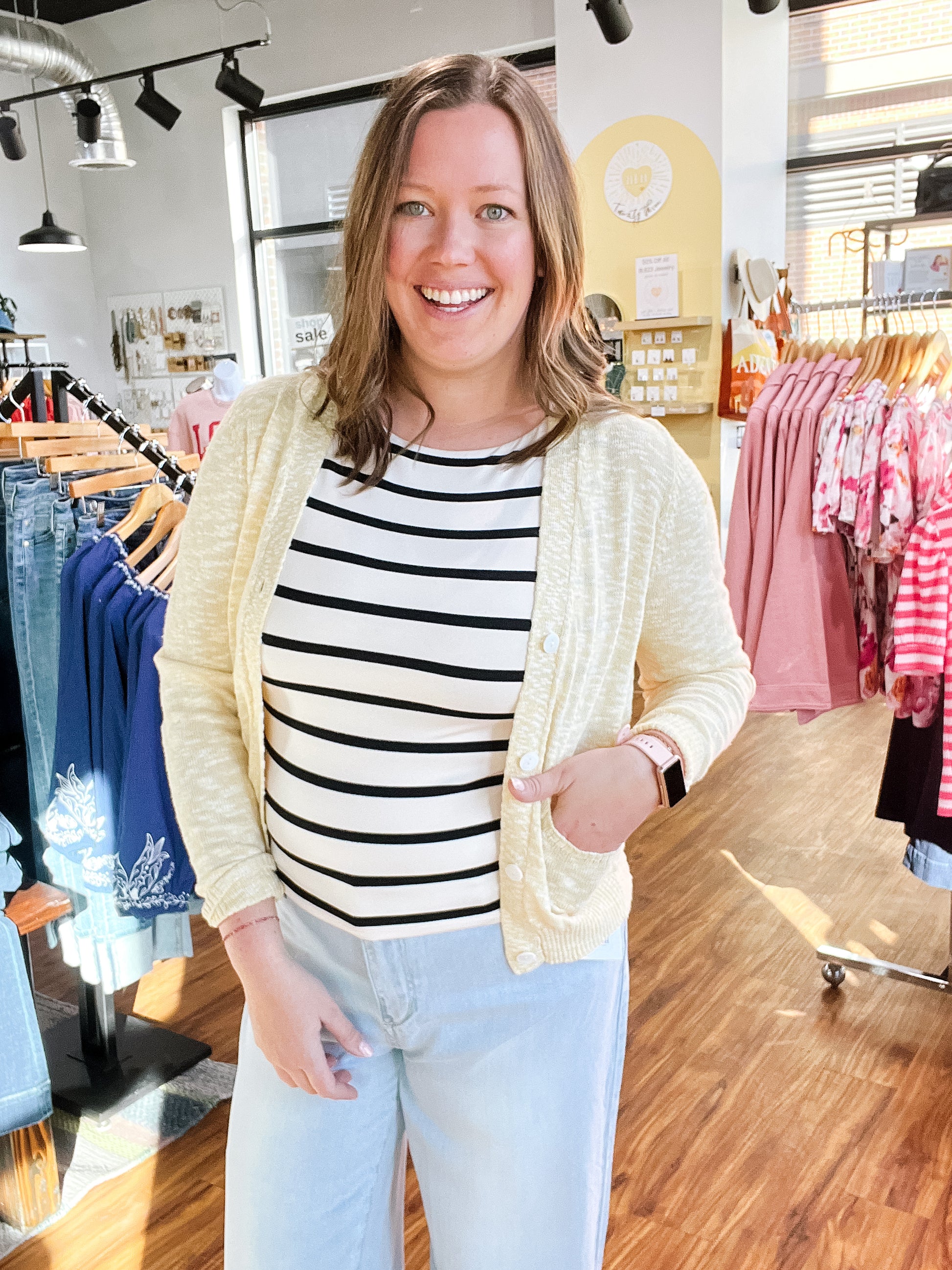 Product Description: Bright and cheerful with a classic touch. This yellow cardigan features a soft white pattern, a flattering v-neckline, and a button-front design for easy styling. Finished with two front pockets, it’s both cute and practical—perfect for layering over tees, tanks, or dresses to add a pop of sunshine to your look.